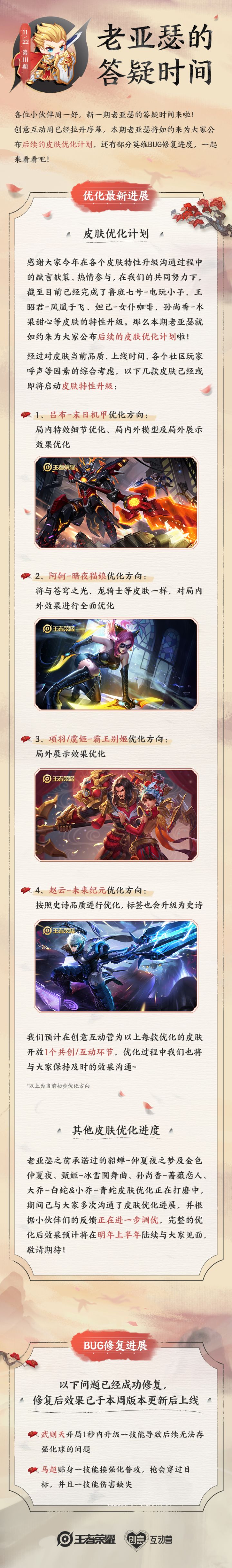 各位小伙伴周一好,新一期【老亚瑟的答疑时间】来啦~王者创意互动周已经拉开序幕,本期老亚瑟将如约来为大家公布后续的皮肤优化计划,包括吕布-末日机甲、阿轲-暗夜猫娘、项羽-霸王别姬、虞姬-霸王别姬,以及赵云-未来纪元。我们预计在创意互动营为以上每款优化的皮肤开放1个共创/互动环节,优化过程中我们也将与大家保持及时的效果沟通~另外还有部分英雄BUG修复进度,一起来看看吧