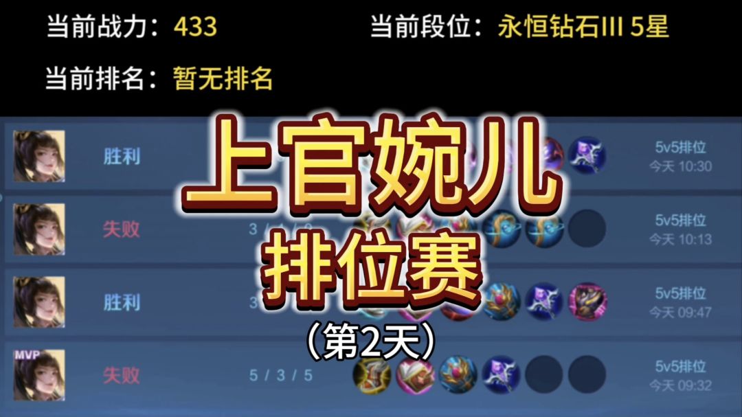 今天是我用上官婉儿打排位的第二天。 第一局,对面一个克制我的英雄都没有,所以这局婉儿还是很好发挥的,但是我好发挥,队友他不好发挥呀,哈哈哈,所以最终我MVP但输了。 第二局,哎呀,为什么感觉就没有伤害打不动人呢,额……他复活甲换名刀了,这种高端操作我至今还没学会,哈哈哈。 第三局,就不多说了,都在画面里了。 这是第四局,问大家一句,吃饭了吗?没吃的快去吃吧,别看完我的操作直接看饱了,嘿嘿。