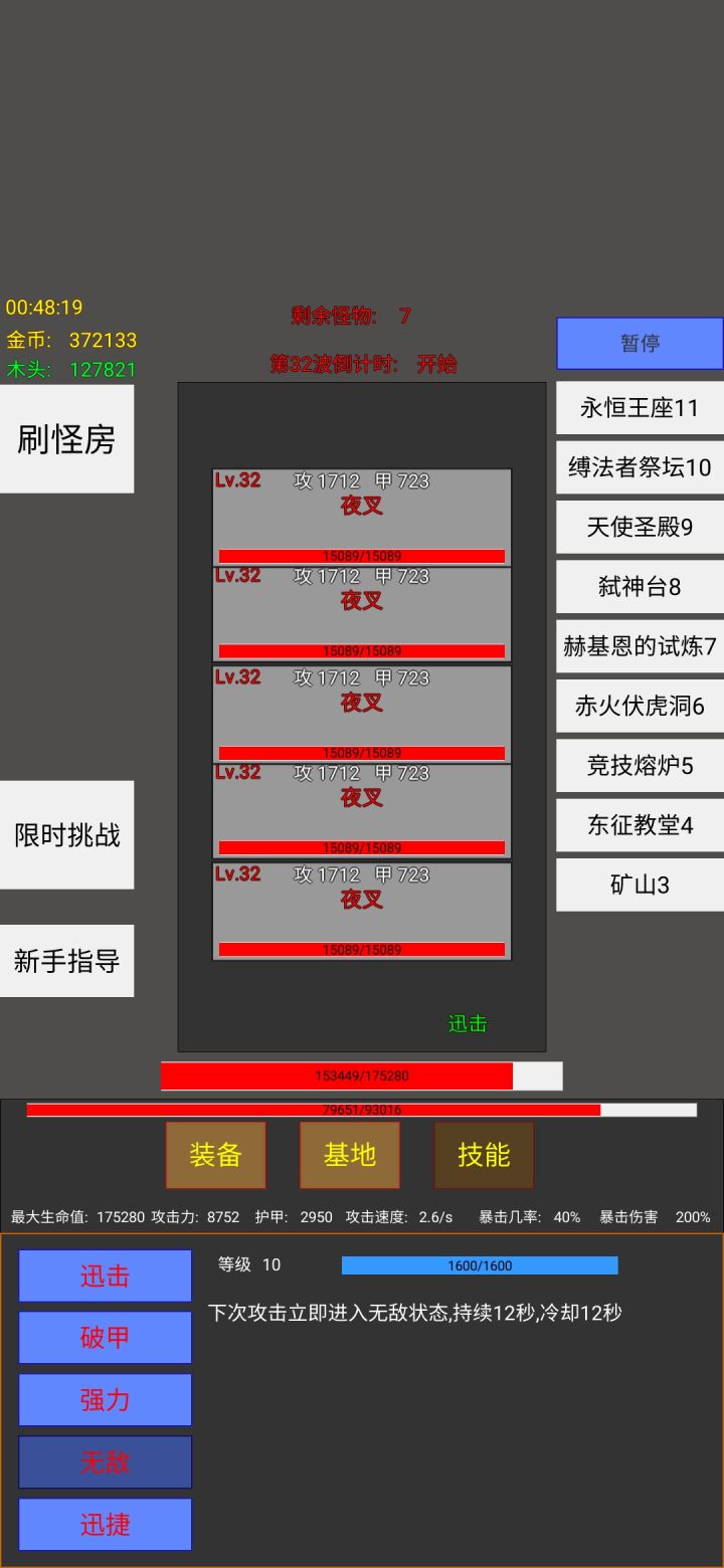 刷个几百万金币换永恒贪婪把宝箱挑战升满,重复刷就解锁右侧BOSS了,然后再刷神丐激怒BOSS出怒焰材料,全部打一遍激活永恒套(每秒回血7%)