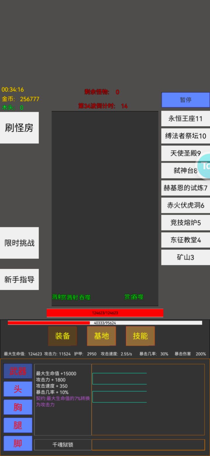 刷个几百万金币换永恒贪婪把宝箱挑战升满,重复刷就解锁右侧BOSS了,然后再刷神丐激怒BOSS出怒焰材料,全部打一遍激活永恒套(每秒回血7%)