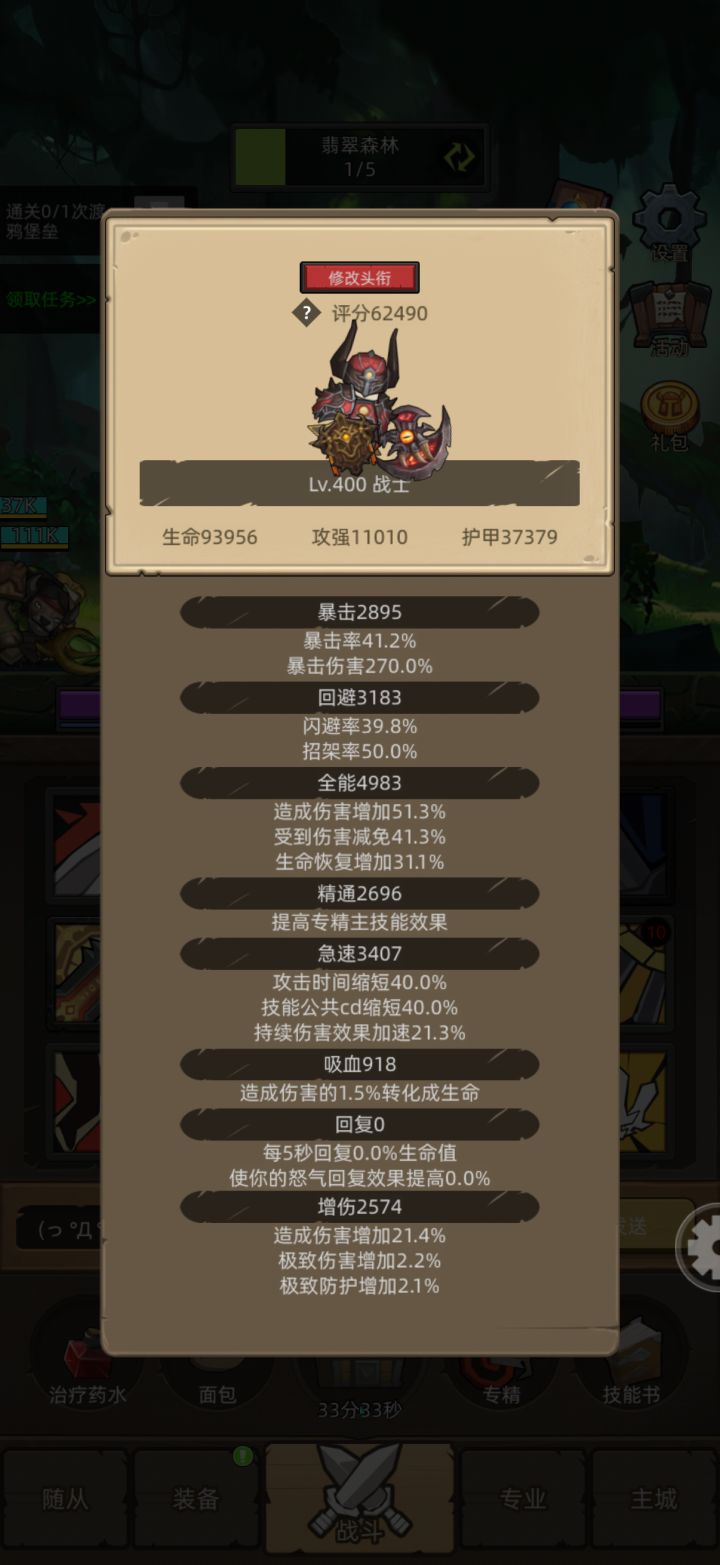 项链错了,而且你暴击溢出1300多,其实属性你可以朝着武器战洗,暴击圆桌满,1条吸血其余增和全,你要是挂机打法急速没用。6万多到8万都可以用武器战,打的比防战快很多,而且硬度不差,8万以上可以搞狂暴战。