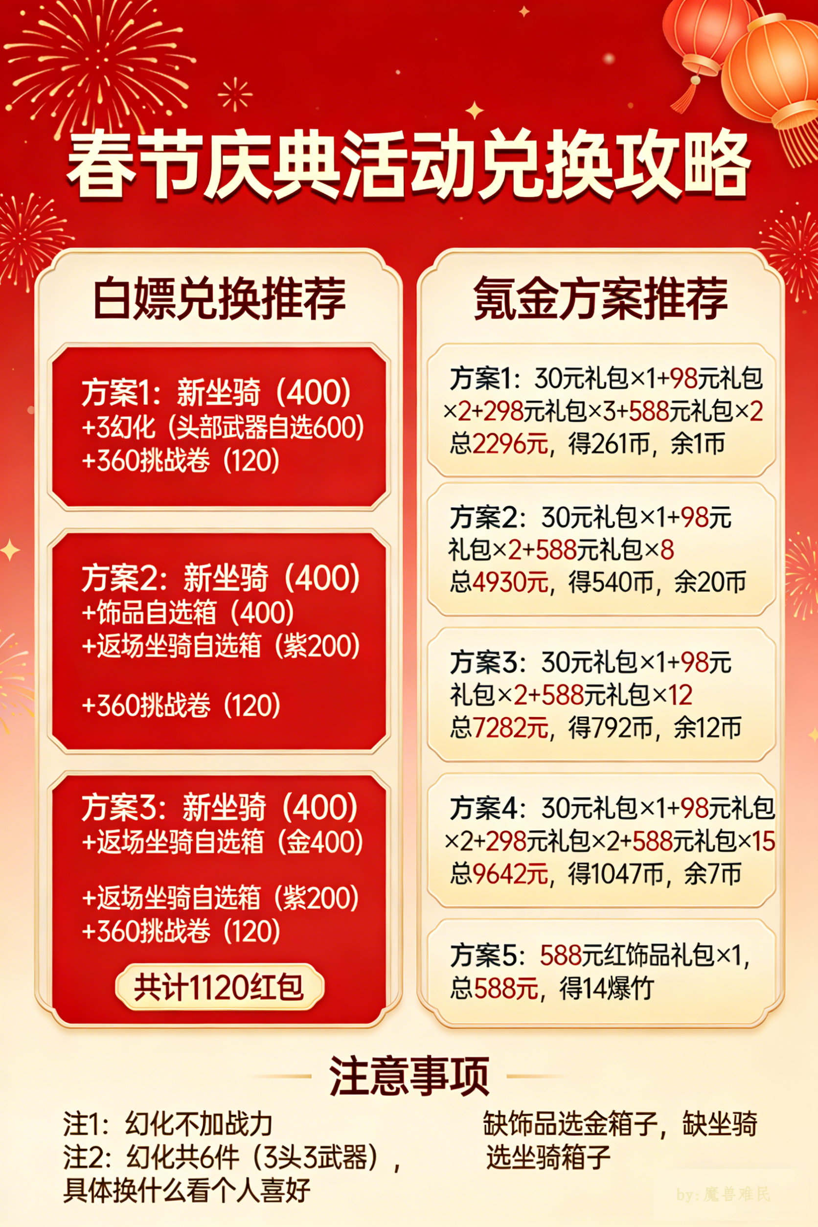 春节庆典活动依旧是老规矩,1120兑换物的普通活动这次不同的是,出了史诗随从返场,但是随从只能氪金获取白嫖兑换推荐(仅作推荐 by:魔兽难民),省流版1、新坐骑(400)+3幻化(头部武器自选 600)+360挑战卷(120)2、新坐骑(400)+饰品自选箱(400)+返场坐骑自选箱(紫200)+360挑战卷(120)3、新坐骑(400)+返场坐骑自选箱(金400)+返场坐骑自选箱(紫2