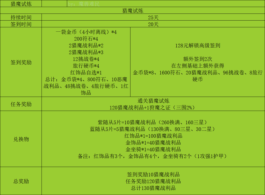 新职业到来之际,还是老规矩,上线了一个职业对应的活动(猎魔试炼只能用魔猎手职业来通关)兑换推荐(仅作推荐by:魔兽难民)1、四星蓝随从2、红饰品+二星蓝随从共计花费130猎魔战利品,这两种方案,都是可以完整的消耗掉所有的战利品,无损耗7天签到会送一个红色饰品自选,再兑换一个,可以获得两个专精的饰品(推荐箭术、魔人)兑换红饰品的方案的缺点是:此职业专精红饰品不通用,无法同时使用两个红饰品