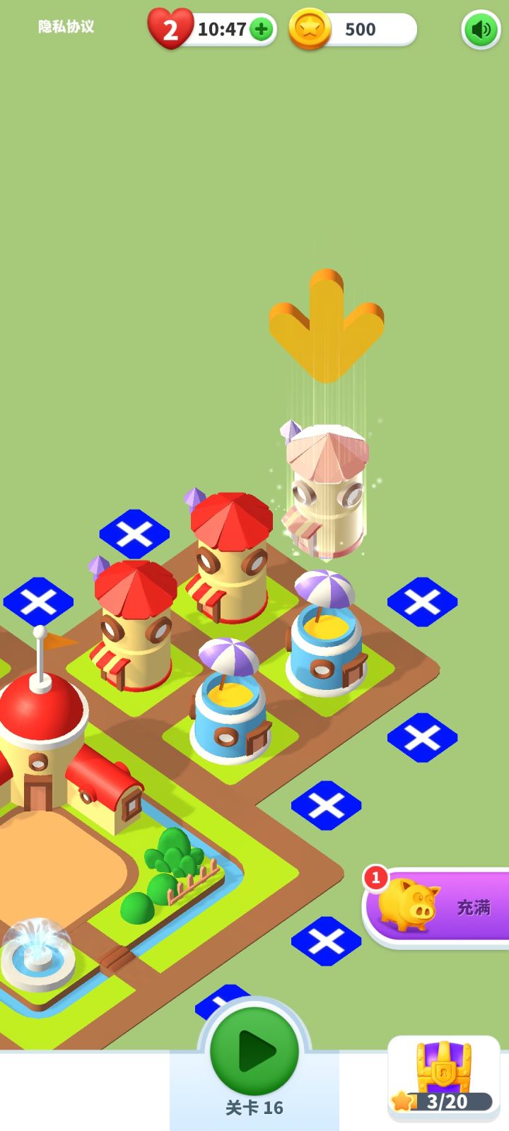 BUG反馈触发前场景:关卡通过回到主界面建筑放置阶段,同时20星集满,右下角箱子处于可开启状态;触发操作:先点击开启箱子且未放置建筑,领取箱子奖励后回到主界面;触发后结果:主界面建筑仍处于未放置状态,底部中间按钮变为关卡,点击关卡按钮无反应(如图)