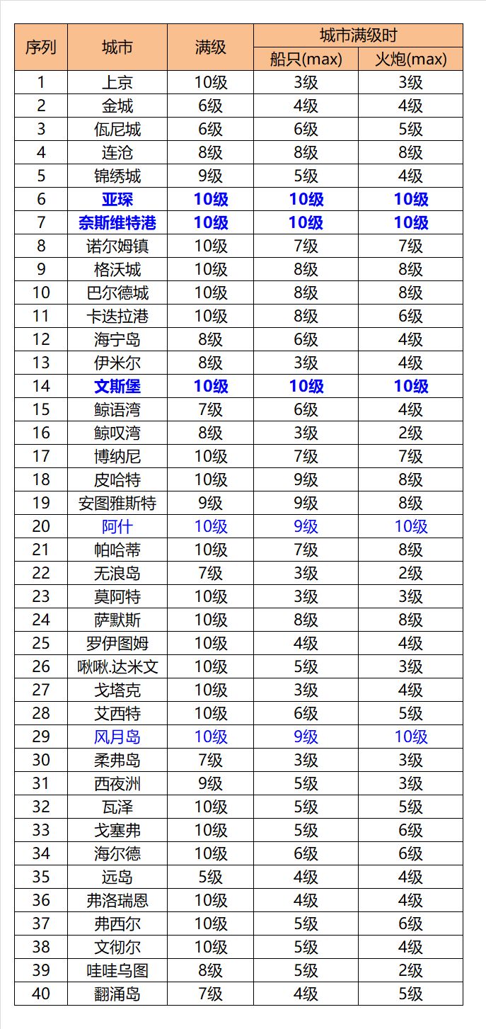 大家好,本篇给大家带来了船坞资料,统计了城市港口投资到满级后船坞可以购买到的最大等级的船只和船炮,资料显示投资满级后可以在船坞买10级船只和10级船炮的港口只有三个,分别是:亚琛、奈斯维特港、文斯堡。 另外也统计了部分觉得重要能用得上的船只和火炮信息,希望可以给有需要的人一点帮助。