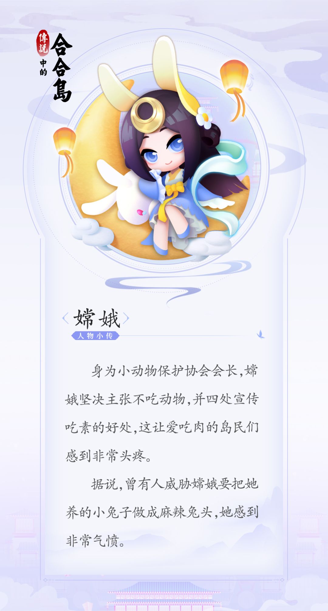 ⭐身份 合合岛居民,小动物保护协会会长 ⭐性格 可爱,温柔,温婉 ⭐背景 嫦娥又称姮娥,是上古神话中的人物。其温柔娴静,美貌非凡。传闻,在嫦娥奔月成仙后,她居住在月亮上面的广寒宫之中,与玉兔日日夜夜生活在一起。 ⭐嫦娥的故事 傍晚,岛上众人齐聚广寒宫门口,鼻翼翕动,神色惊异。一股极鲜肉香自门内飘出,绕场三匝,引得众人口水直流。 月兔蹦跶到众人面前,兔爪中的捣药杵“砰——”的一声插进土里,扬起一阵灰
