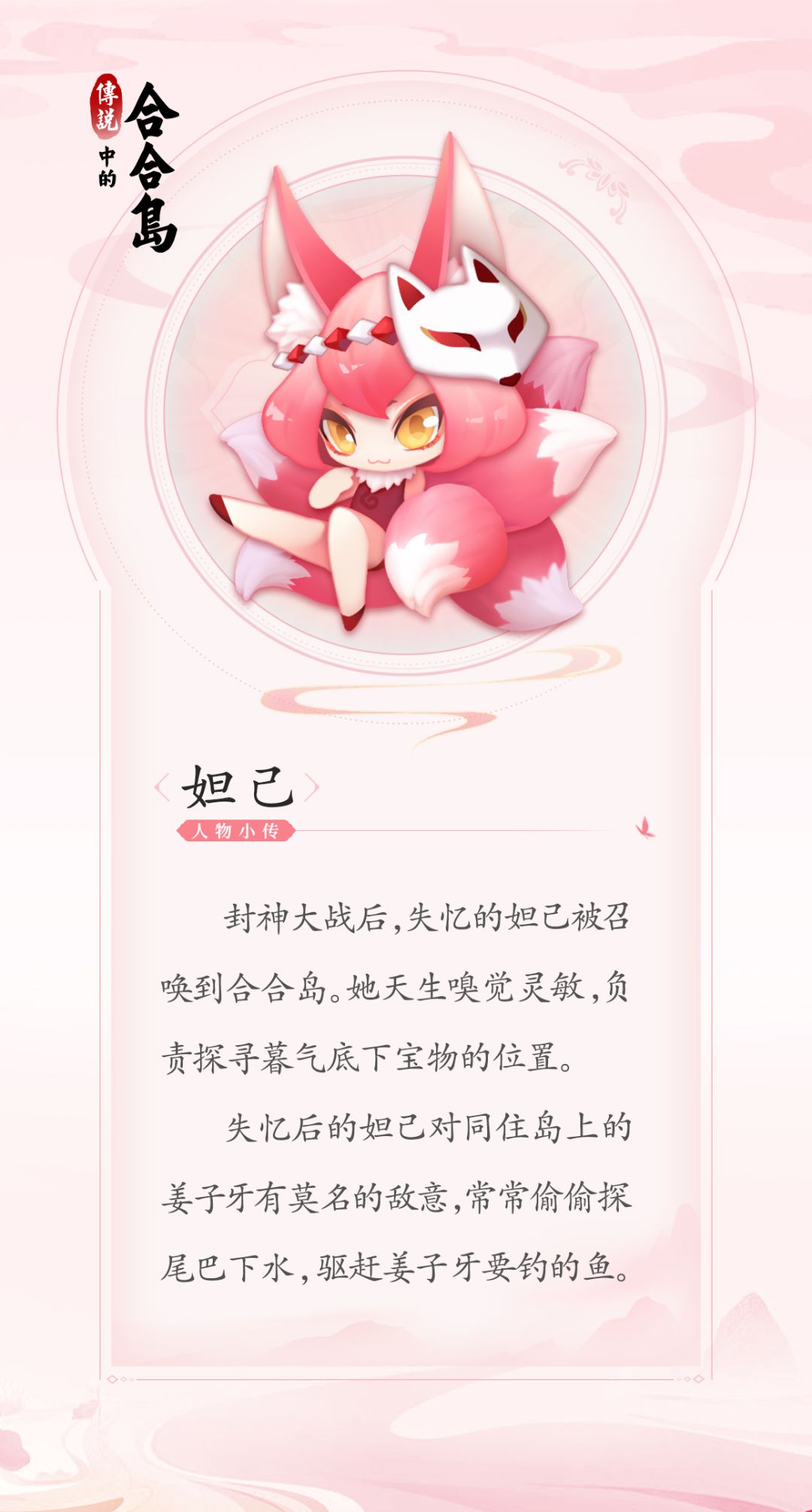 ⭐身份 合合岛居民 ⭐性格 表面可爱,软萌,白切黑 ⭐背景 妲己是商纣王的妃子,出自有苏氏。在神话传说中,妲己奉女娲之命,入朝歌于宫中为妃侍奉商纣王并将其迷惑,以使殷商亡国。她蛊惑纣王干下了种种的祸事,最终断送了商朝的天下。 ⭐妲己的故事 “妲己又翘班了。”“我们去找找吧。 ”虞姬和白素贞叹息一声,从湖边匆匆掠过,一旁钓鱼的姜子牙岿然不动,熟视无睹。 而就在这时,一条粉红色的尾巴从一旁的树后探出。