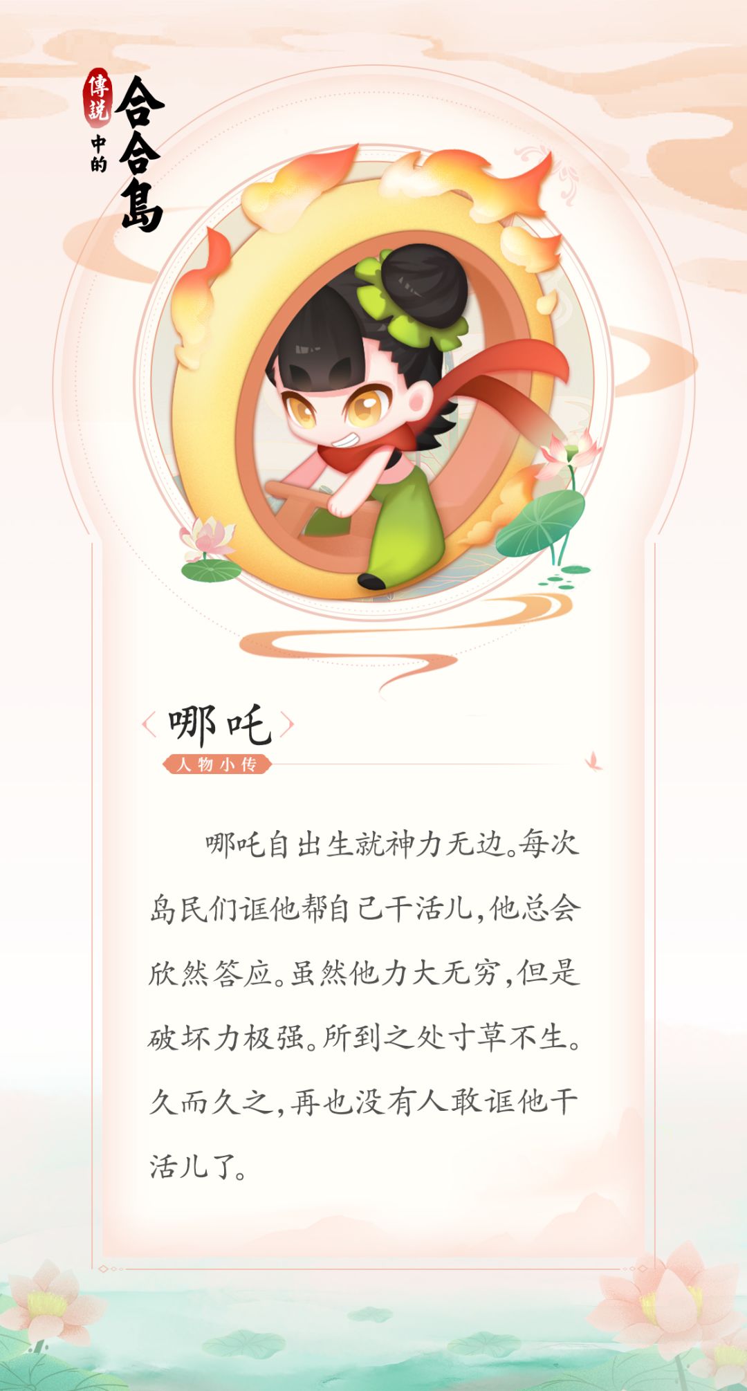 ⭐身份 合合岛居民 ⭐性格 中二,热心帮倒忙 ⭐背景 哪吒的传说很早就在民间流传。明代的《三教源流搜神大全》就有了哪吒闹海,重塑莲花身等经典故事。后来创作的《封神演义》、《西游记》等小说话本则继承了这些描述,使得哪吒形象更加鲜明。 ⭐哪吒的故事 关羽:“最近白蚁真是泛滥成灾,我这赤兔马阁楼都快被蛀空了,得好好修理一下了。 ” 关羽抚须长叹,一旁路过的哪吒立刻脚踩风火轮,直冲到了关羽面前。 哪吒:“