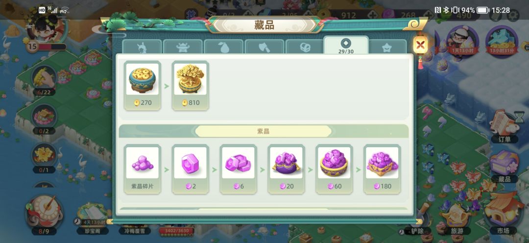 零氪玩家攻略建议 1.资源—金币、紫晶、如意 这三种是重要资源,金币和紫晶可以在商店购买物品,紫晶可以购买金币,金币可以购买体力。如意则是开荒要用到的。点亮图鉴查看到的数值可以发现,三合一基本没有数值增长,所以五合二回划算一点。个人为了节约空地,基本在点亮图鉴之后就不再合成这三样,直接收了。可以根据自己需求决定是合成还是直接收取。提示:七天任务完成后的每日任务里有需要收取一定数量金币和消费紫晶的任