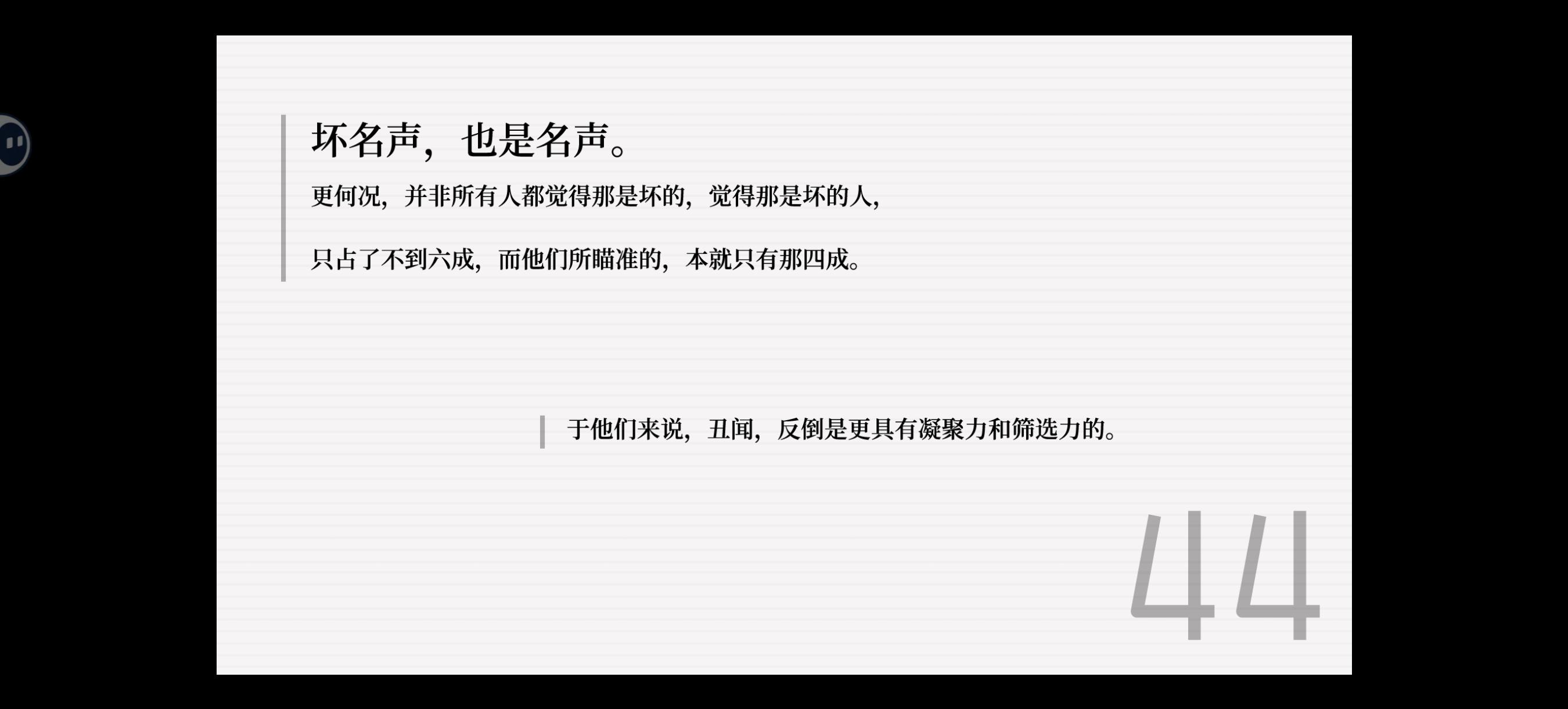 这款游戏不会花费太多时间 但是在阅读完整个文本内容后 会发现其实文章中写到了很多社会中存在着的真实问题 阅读过程不会无聊 极具反差的图文结合让我觉得画面可以说的上简约精致 在网络世界中 是不是可以做到肆无忌惮的发表言论 给他人打上标签? 就像最近发生的骑手事件…