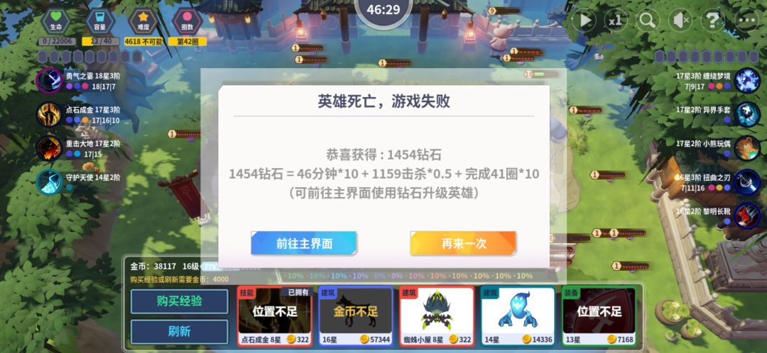 游戏前期有难度 后期刷出装备和技能二阶就很简单了 前期技能只带四个 点金 践踏 勇气 守护 其中点金三阶和践踏二阶必备 其他随意 装备方面除了加回复的其他都带 然后缠绕和武器三阶 建筑方面只要记住一点 两个怪的都不要 什么蜗牛 幽灵 狗通通不要 其他随便升 那个星高就给他凑三阶多刷钱 玩上十次八次就会很熟练了