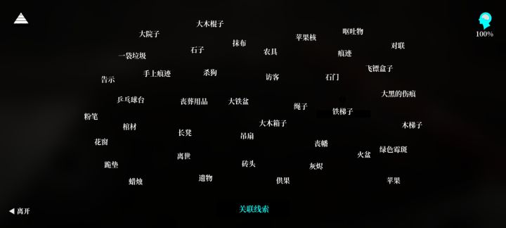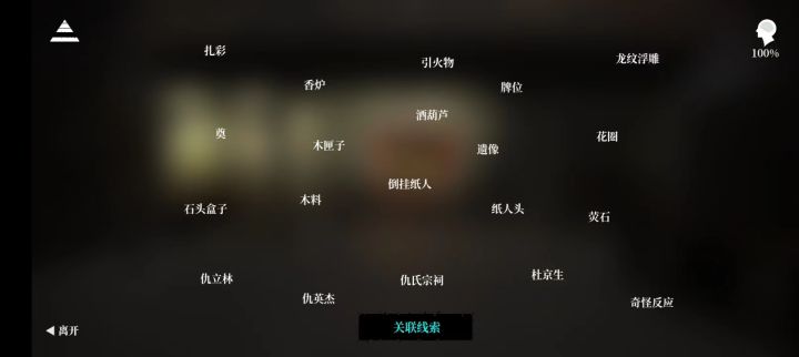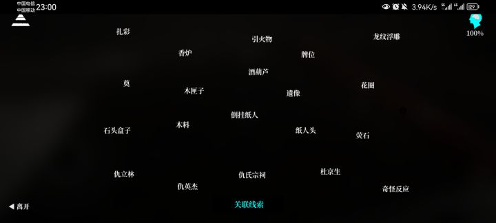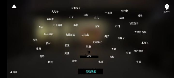 祠堂后面的门通过会触发杜京生离开或回来后来还会触发英杰离开1呕吐物 绳子旁的地上手上痕迹 杜京生左手手心大黑的伤痕 大黑狗头部绿色霉斑 杜京生走后,他坐的地方灰烬 火盆边上的黑色一块大木棍子1+苹果核1+呕吐物1+手上痕迹1+绳子1+大黑的伤痕1+苹果1+奇怪反应2+大黑狗3=杀狗2奇怪反应 获得 绿色霉斑1 后等杜京生回来聊这点酒葫芦 得到 元祖的计划3 后在尸体头部得到3