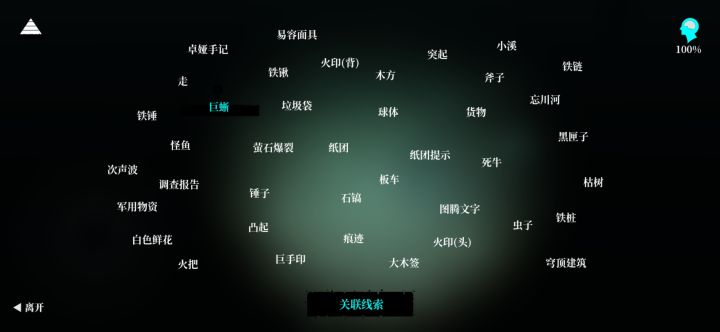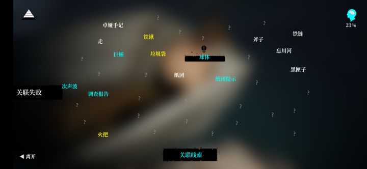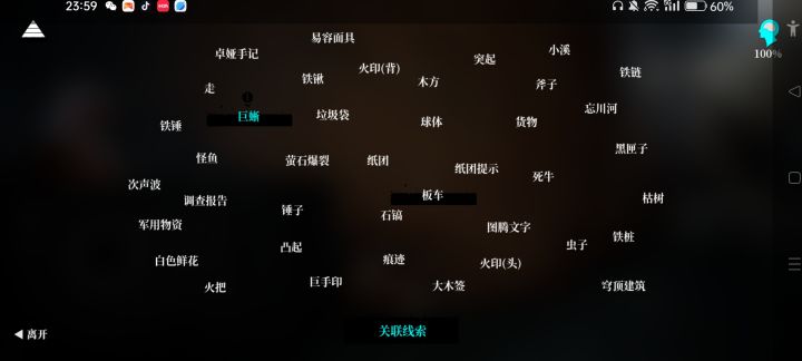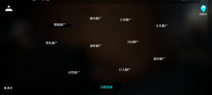 高能是巨多僵尸。线索总览部分线索1.下蹲进入水下能得到黑匣子和纸团。2.上吊僵尸的左大臂有手臂伤痕,胸口有印记。3.刀山僵尸的印记在左脸,走上木桩的最边缘点击跳跃,跳到空中的时候方向往前就能上去了,多试几次。4.虫子在僵直僵尸的左大腿,爆头点击女性僵尸的头部线索关联1.次声波+调查报告+巨蜥+球体+纸团提示+斧子——液得出之后点击球体,会自动进行操作,这里开声音会有刘sir的喘息