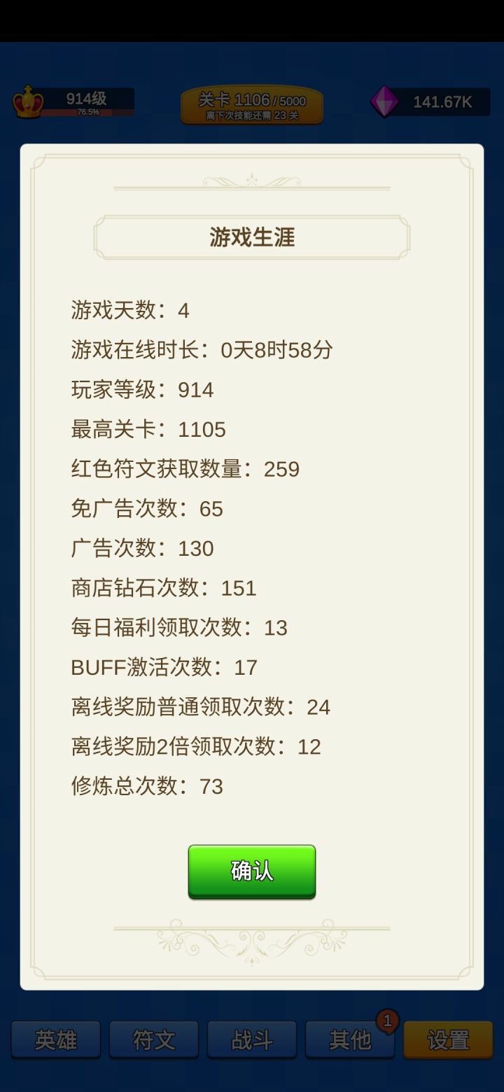 小鱼的几款游戏都玩了,简单易玩,不氪不肝,每一款基本都是瞄准一个核心养成来慢慢收集,广告也非常人性化,现在都是看1免2,收益可观,不想看也没关系。总的来说,非常适合上班族养老族打发时间。建议把符文上限增大一些吧,离线挂机一天,收2次符文基本都快满了,我要收集全套纯词条符文。
