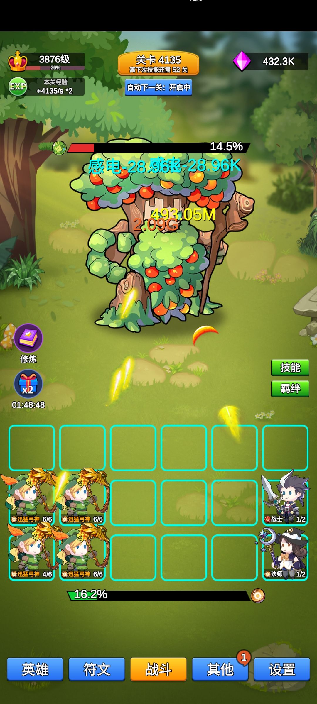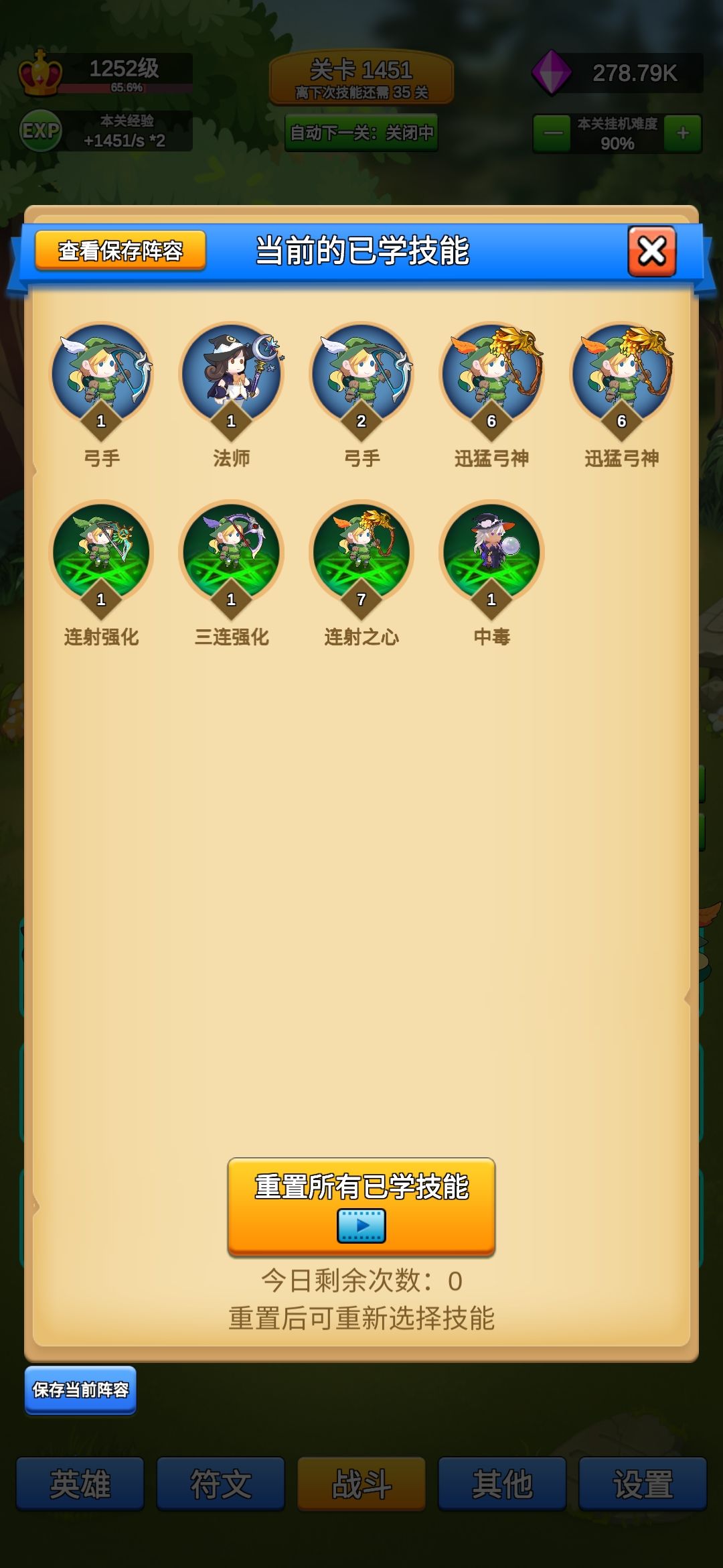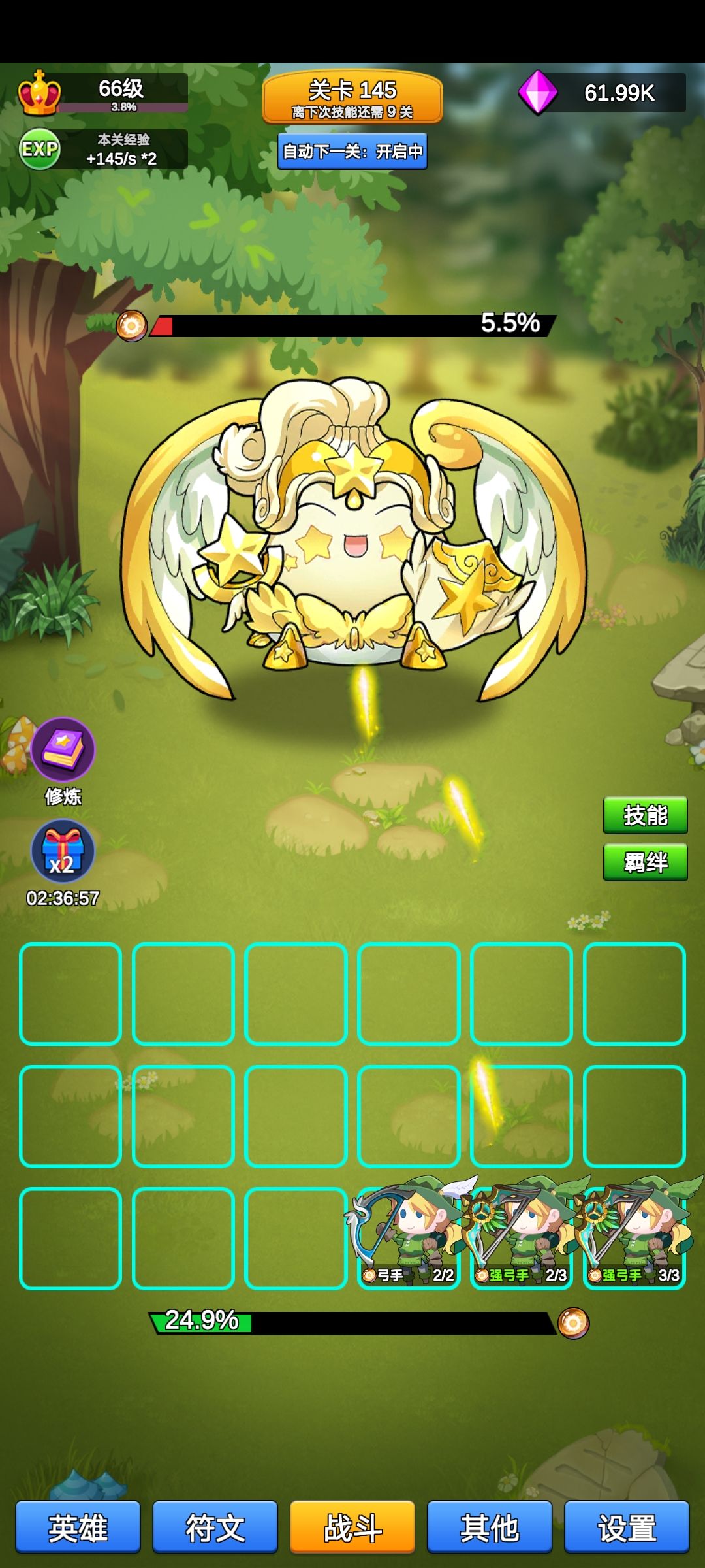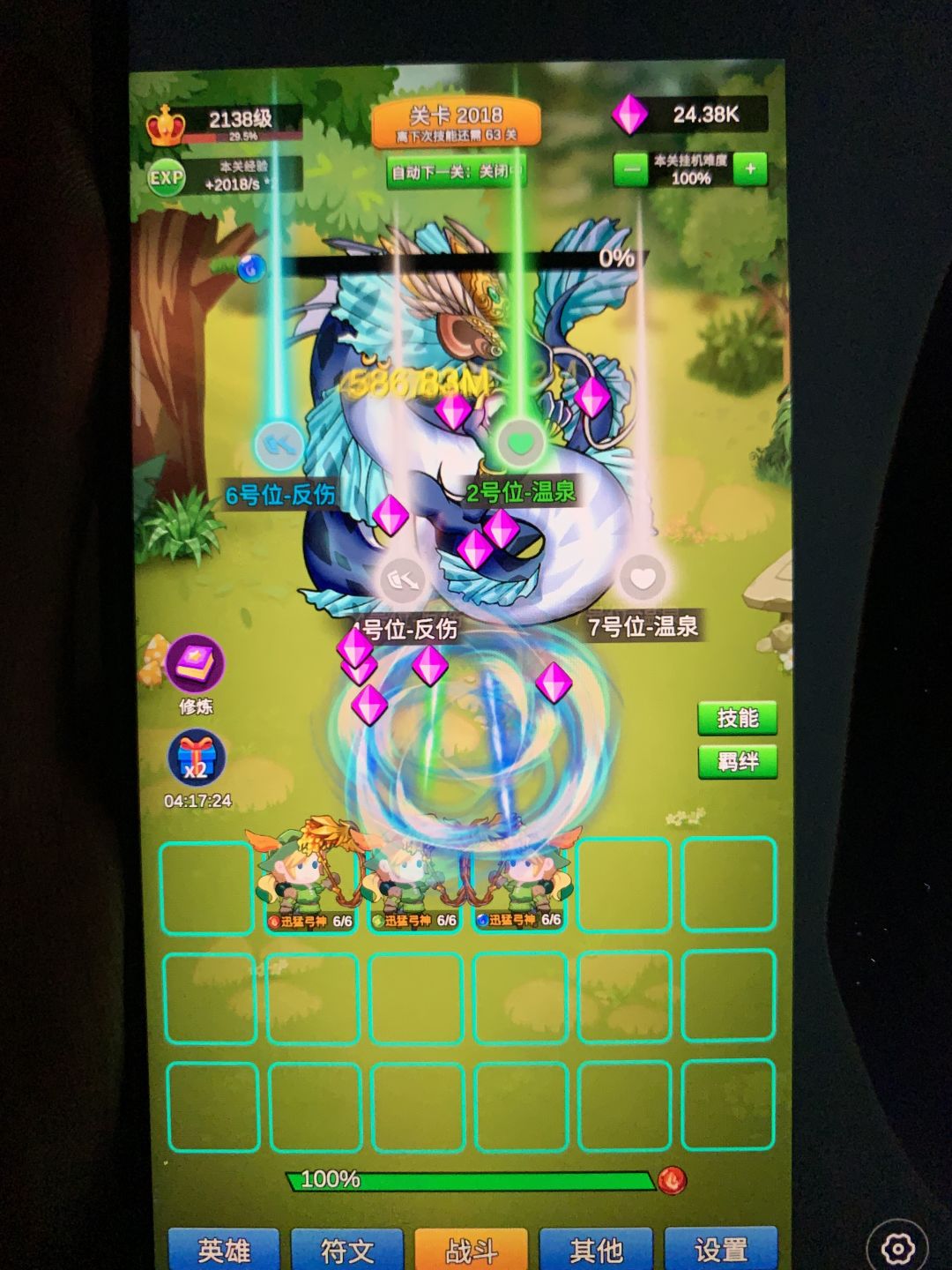 只为咸鱼玩家挂机少走弯路。先上图 没有看满广告,没有特意刷阵容,也没有专门挂机刷符文,相信大多数人属性配合都比我好。 通过本身实验,纯光弓,纯火战前期较强,打到4000没问题,看样子5000也不会变。后期可能会有法系队伍,但需要一定肉度,现在玩起来不爽快,到了万层左右我再来尝试。 纯光弓,在出2个满级迅猛弓神之前,优先等级,再升满终极技能,然后继续补迅猛弓神,补到3-4个,补满所有技能等级。 实际