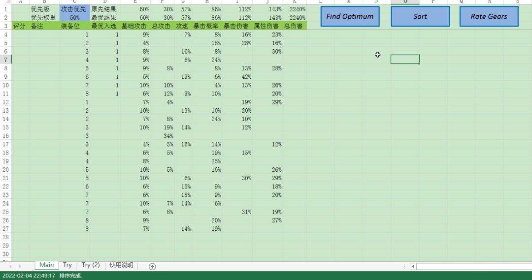伤害计算公式:(1+基础攻击%)*(1+总攻击加成%)*(1+攻速加成%)*{1+暴击概率加成%*(基础暴击伤害100%+暴击伤害加成%)}*(1+属性伤害加成%)装备选择可能是反直觉的.第一套装备, 我采用优先满攻速, 满暴击.第二套装备, 是用Excel自动寻找的最优组合.实际第二套能多出60%.第一套:第二套:计算结果如下:更悲哀的是, 就算次优选择都比原来的强14%.(