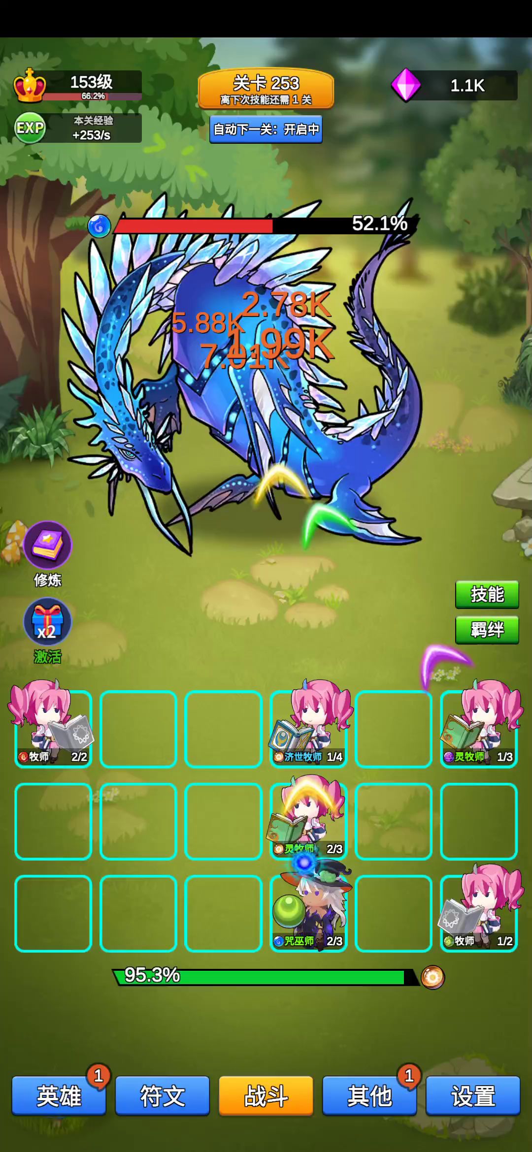 只为咸鱼玩家挂机少走弯路。先上图没有看满广告,没有特意刷阵容,也没有专门挂机刷符文,相信大多数人属性配合都比我好。通过本身实验,纯光弓,纯火战前期较强,打到4000没问题,看样子5000也不会变。后期可能会有法系队伍,但需要一定肉度,现在玩起来不爽快,到了万层左右我再来尝试。纯光弓,在出2个满级迅猛弓神之前,优先等级,再升满终极技能,然后继续补迅猛弓神,补到3-4个,补满所有技能等级。实际