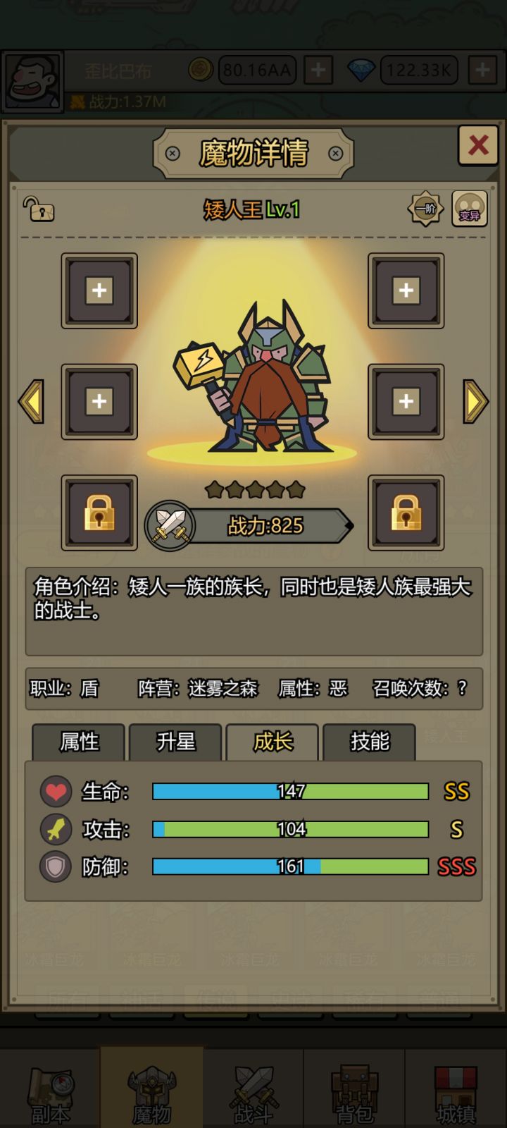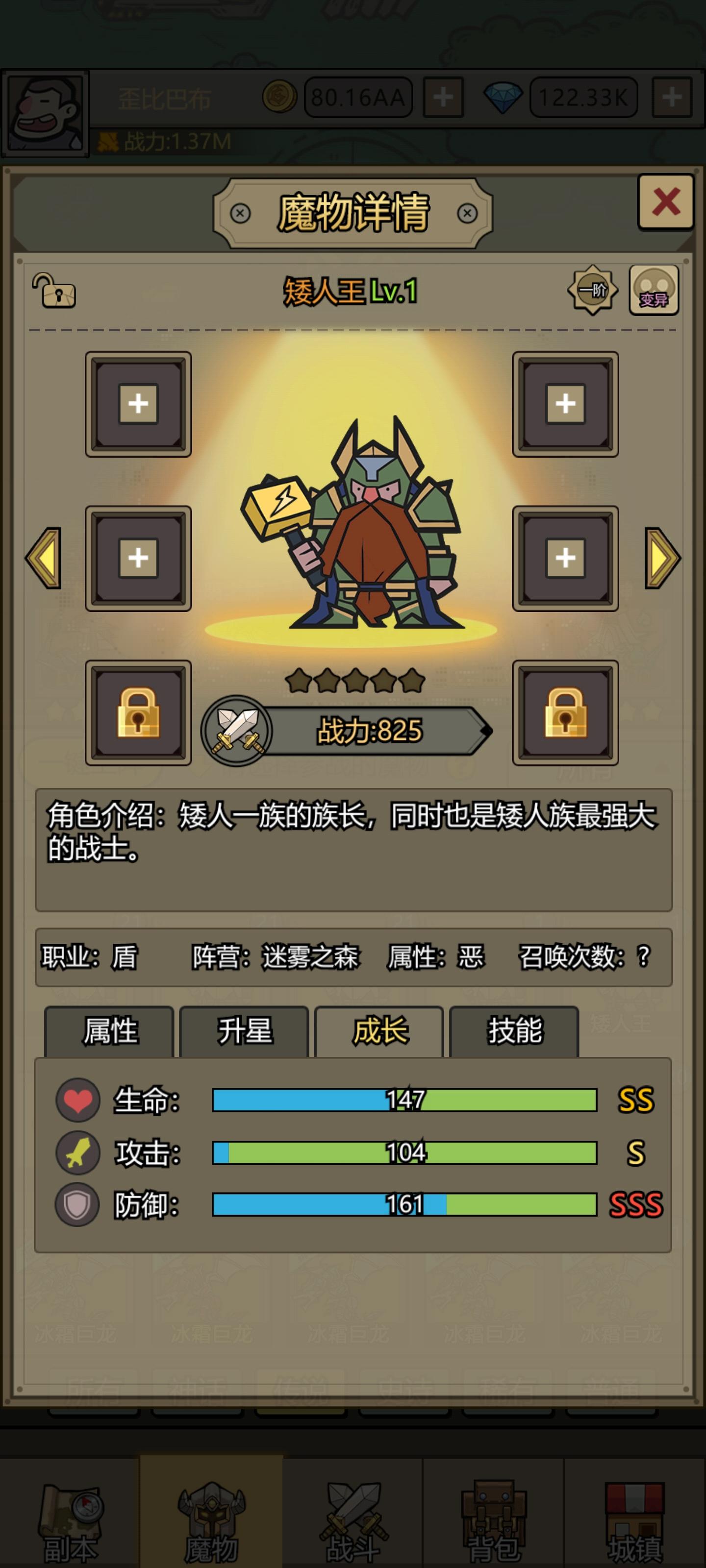 阵容上,前期建议1-2个盾,加上1-2个刺客。没有足够的盾,可以用战士代替。刺客推荐精灵王和吸血鬼,没有这两个,可以练精灵弓箭手(精灵王的下位替代),星级一定要高。五星的蓝弓接近于三星的精灵王,如果两者相同星级,建议精灵王。盾建议矮人,它的理论最高属性应该是SS S SSS。前期没有矮人或精灵王开局,可以重置游戏进行刷(也可以不刷)。