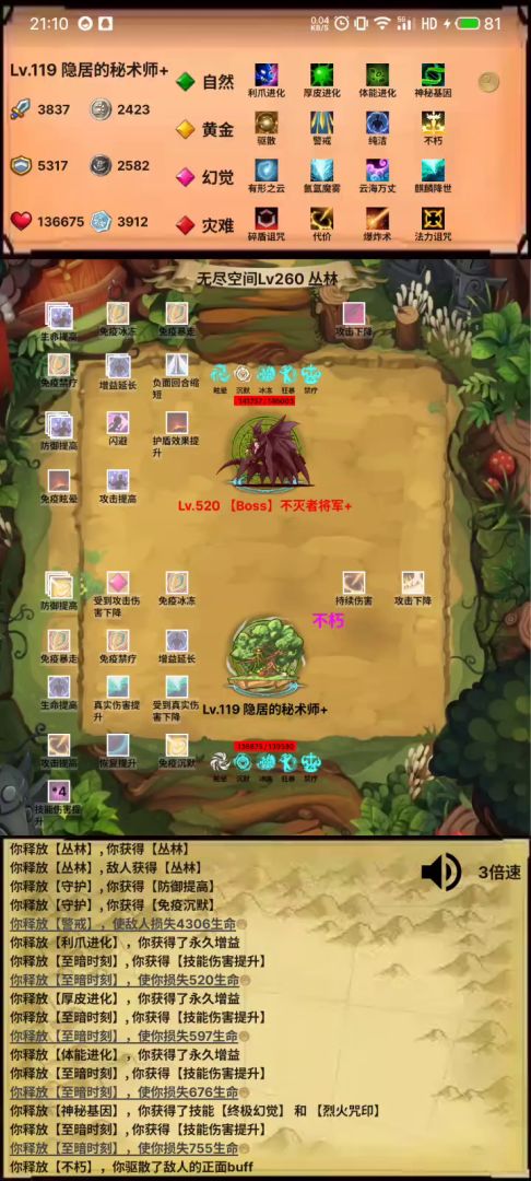 但到目前为止还不完美,进入无尽之后可以点4天赋7技能,点出自然的丛林战场和幻觉的大地之盾,丛林5技能可以免疫沉默,大地4技能免疫眩晕,技能就完整了