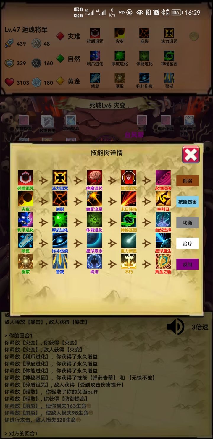 游戏有3大徽章:白、黑、蓝分别对应游戏的10大元素:白色:阴影、战争、黄金黑色:机械、恶魔、灾难蓝色:光芒、自然、魔法、幻觉普通模式最多可以获取3种元素以及5种技能如果中途拿了2元素5技能,想获取第三种元素,它会自动删除一个升级最少的技能如果中途拿了3元素5技能,想更换其中一种元素,它会让你选择替换哪一项元素的当然,你也可以用单元素5技能通关,但也是可以再选2个空技能元素留给无尽的