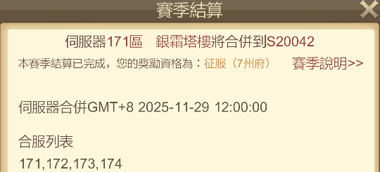 我们将于8月11日13:00-19:00(GMT+8)进行全区维护,维护完成后会发放补偿钻石*600。维护主要内容: 1、天下大势-厉兵秣马:完成条件改为2个联盟达到40人; 2、天下大势-诸国初统:完成时间延长至15天; 3、每日双倍调整为每日三倍,获得钻石120改为180; 4、S1攻城难度调整:龙之心耐久120000减少至100000,守军从40队减少至30队;八级城守军从30队减少至25队