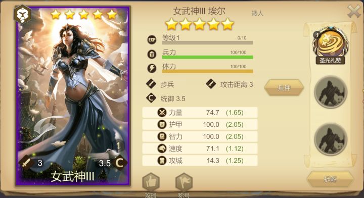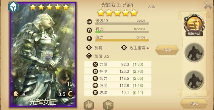 专属技能非常明了,自身减伤、队友增伤,妥妥的建队核心,即插即用,适配广泛;光环技能在准备阶段就生效了,配合女王骑兵平均水平的速度,应该说滴水不漏了