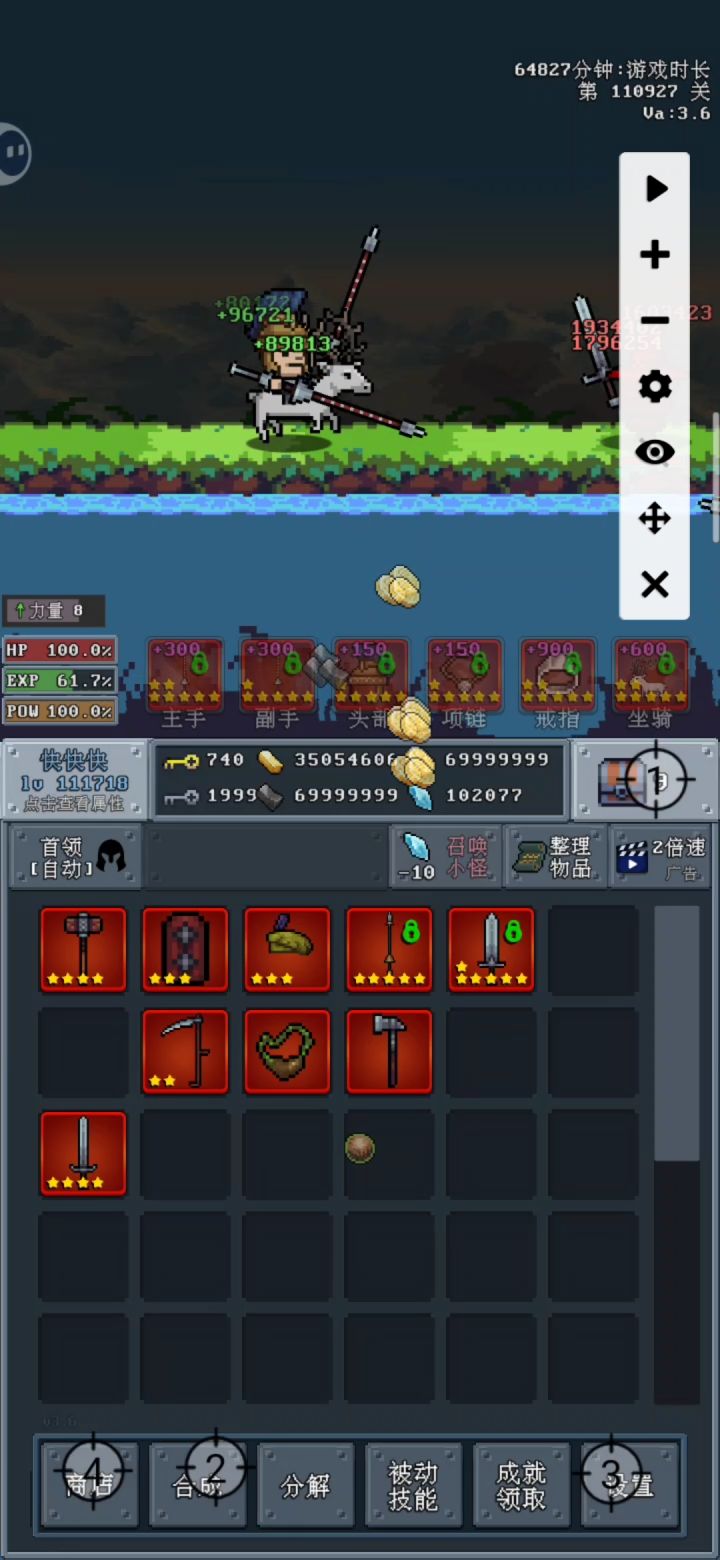 建议作者把初始速度改到两倍,广告速度4倍,前期材料爆的量多一点,不然一小时劝退所有人,肯定有很多人装备都没词条就退游了,而且还不能挂机收入