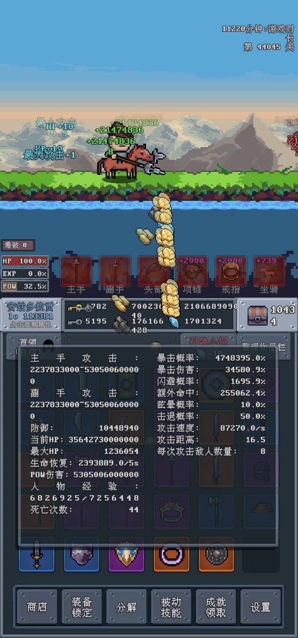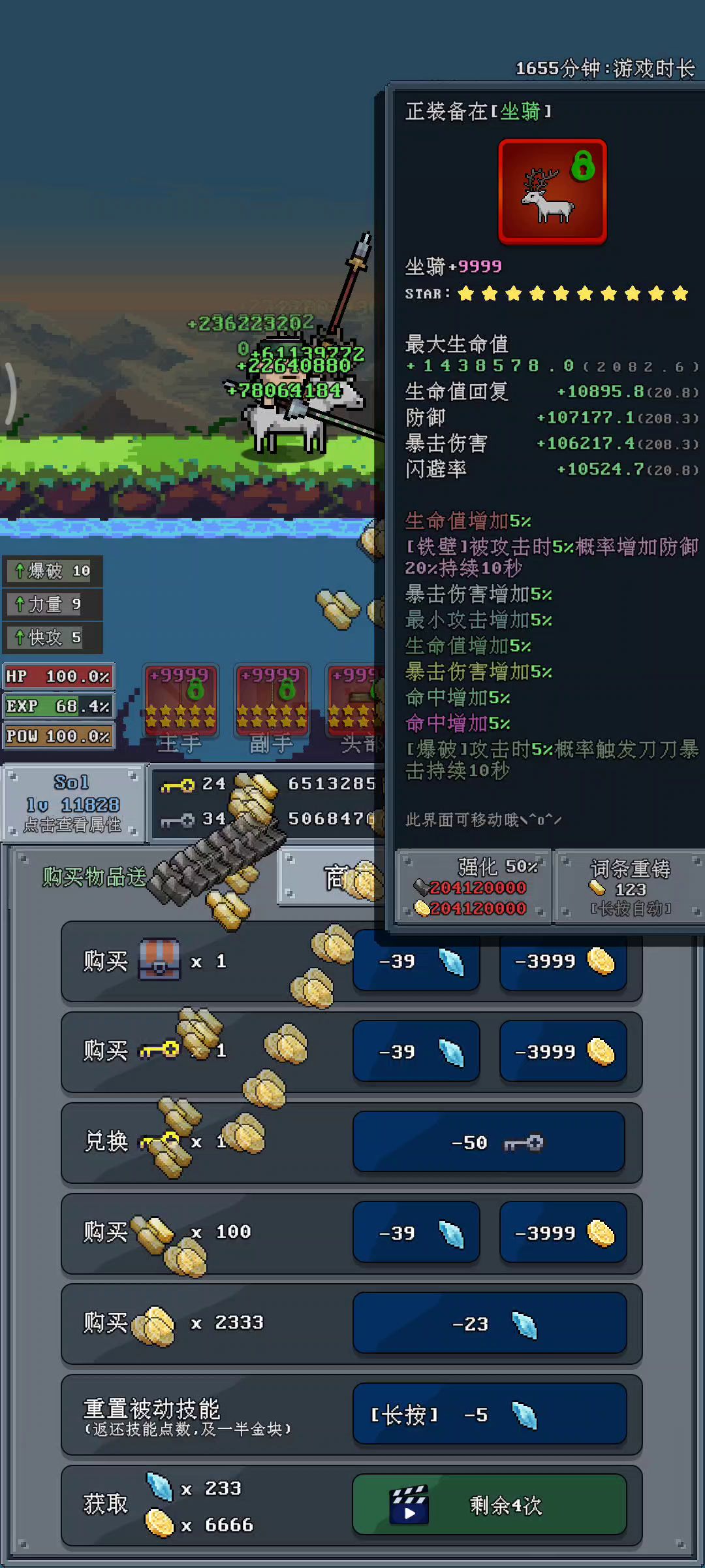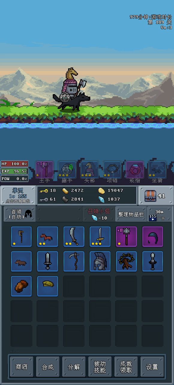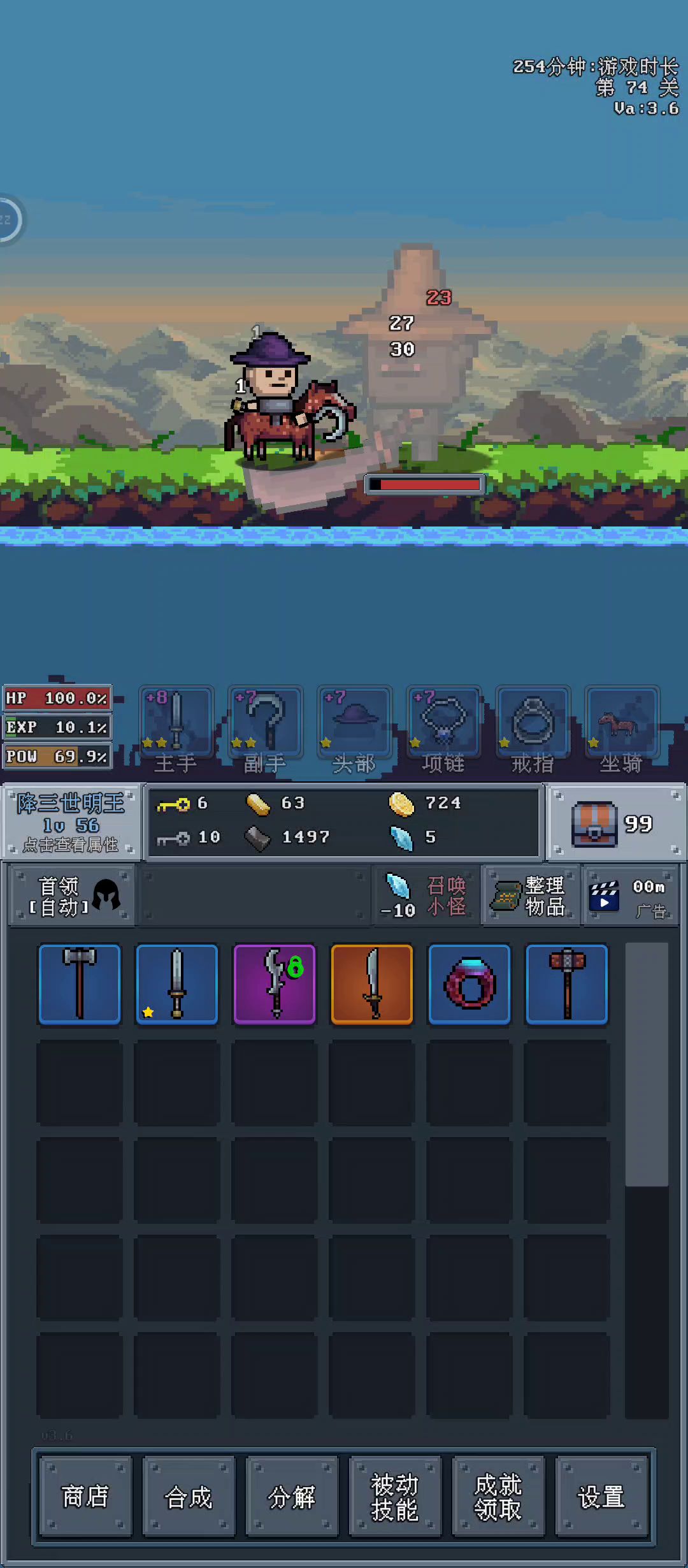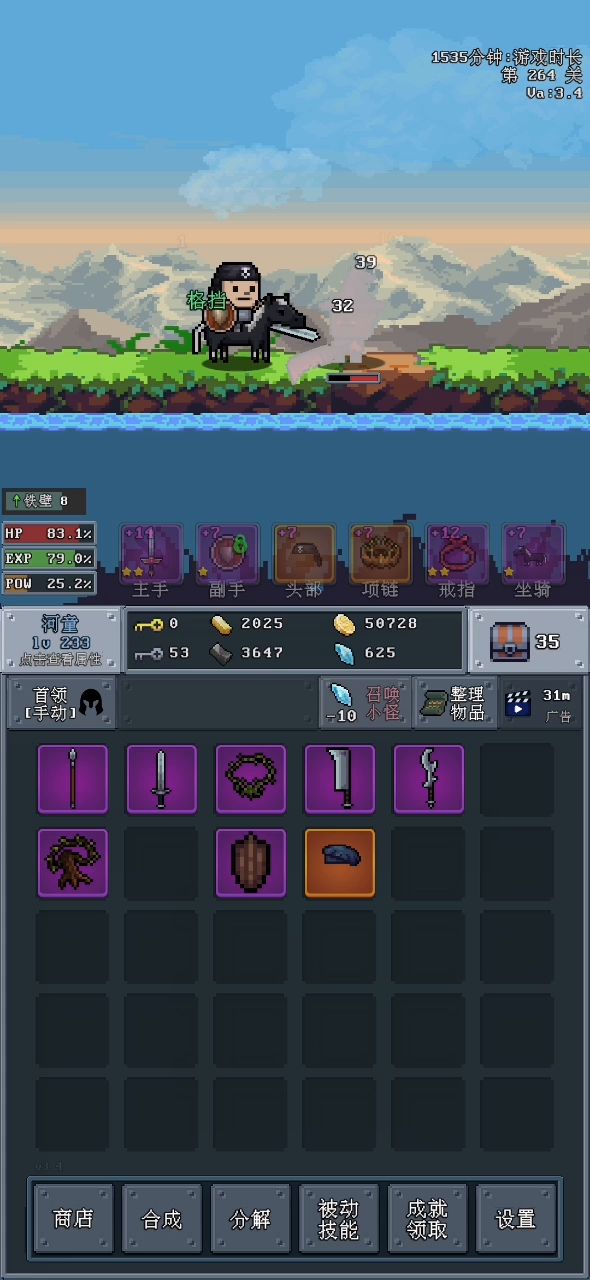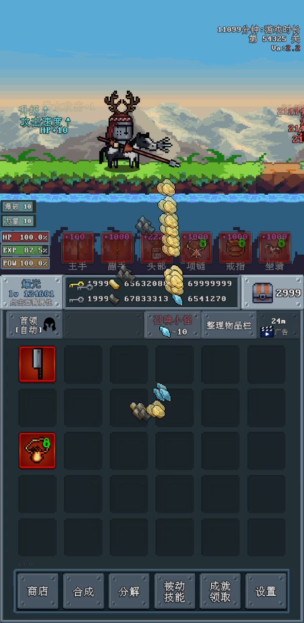前方再无怪物可打,战士孤身奔跑在茫茫的河堤上,前方一马平川,一片国泰民安的景象。只是可惜,已无回头之路。而家,在身后的远方。 徘徊着的…在路上的… 你要去哪儿…via…via… ……… 给作者的一点小建议: 1、关卡不建议用浮点类付值给int,会少点两位的精度值。 2、数值溢出前建议用INT_MAX限制最高位(其他语言大概同理)。 3、建议用long long int定义大部分整数类型。 4、如果能做个通关小故事或小动画就更好了。 祝作者做的越来越好!这是玩了这么多游戏以来第一个不肝不氪不费神的,算是这乱七八糟的世界中的一股清流!!持续关注作者,继续玩作者以前的其他作品。😘