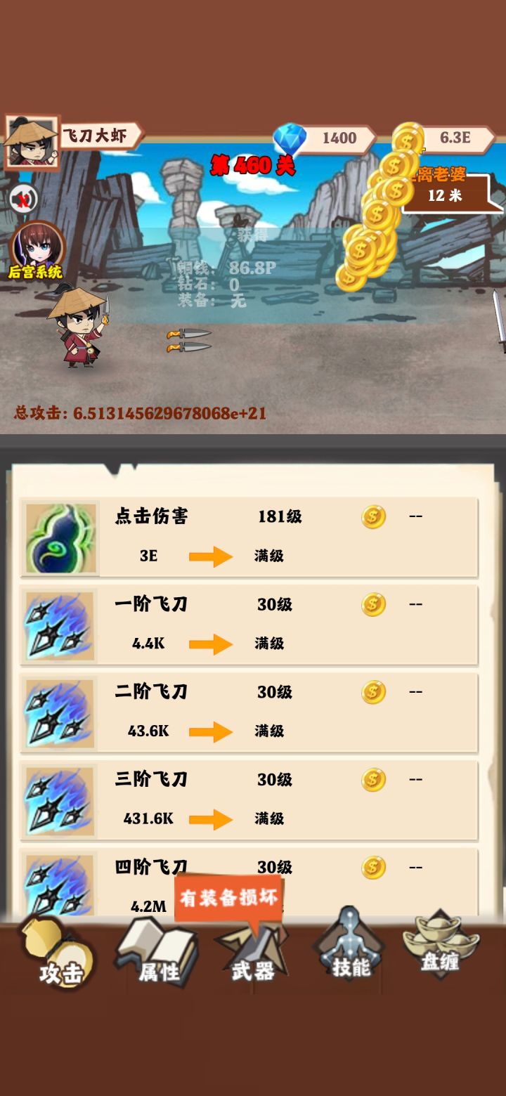 突然攻击就变成这样了,玩了一个多小时,快点修复bug吧,技能里技能消耗金币点满是降低100%,就等于升级飞刀不需要金币