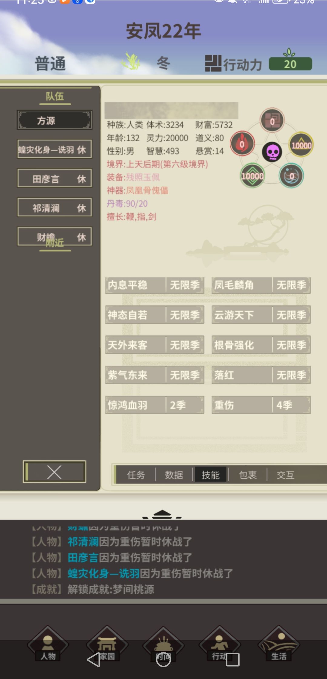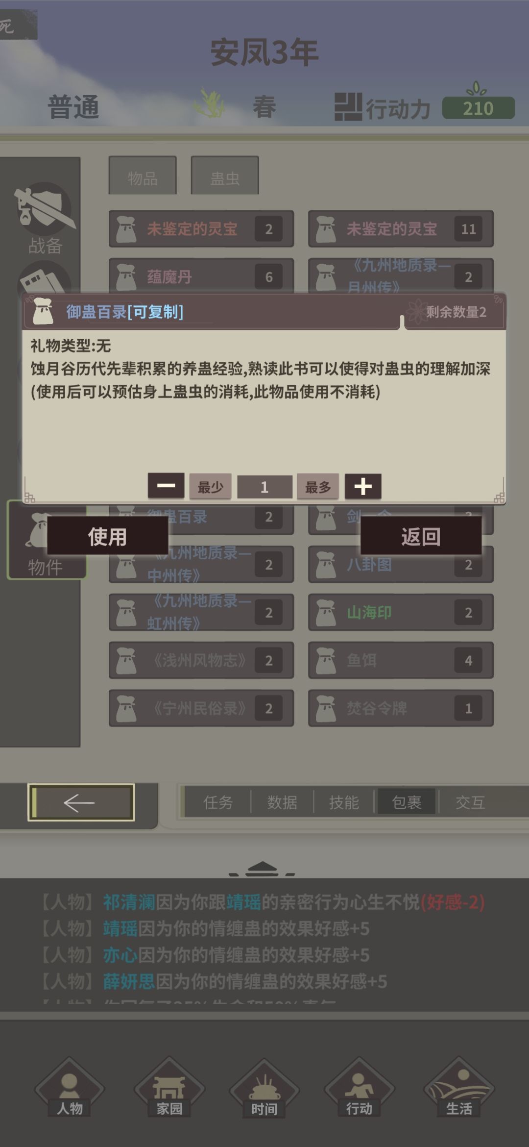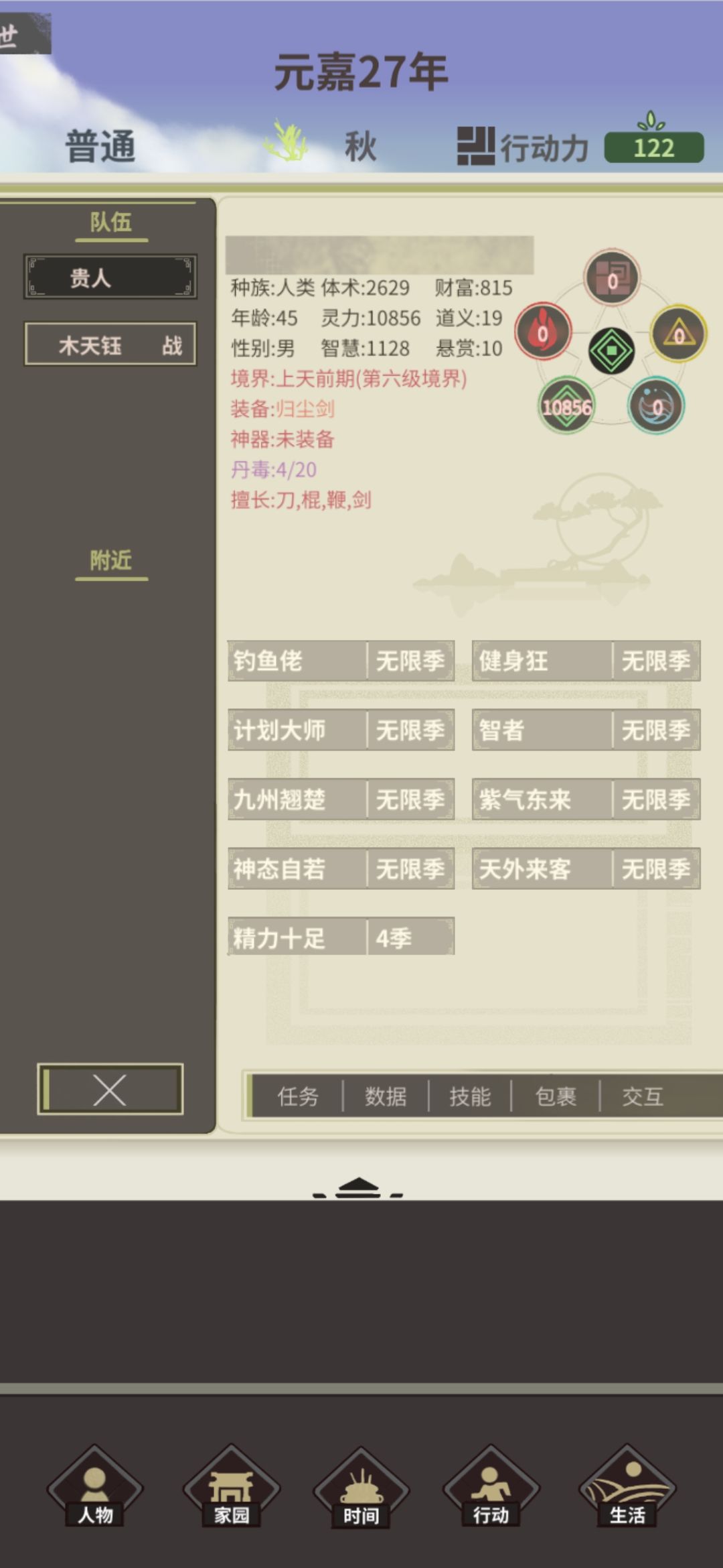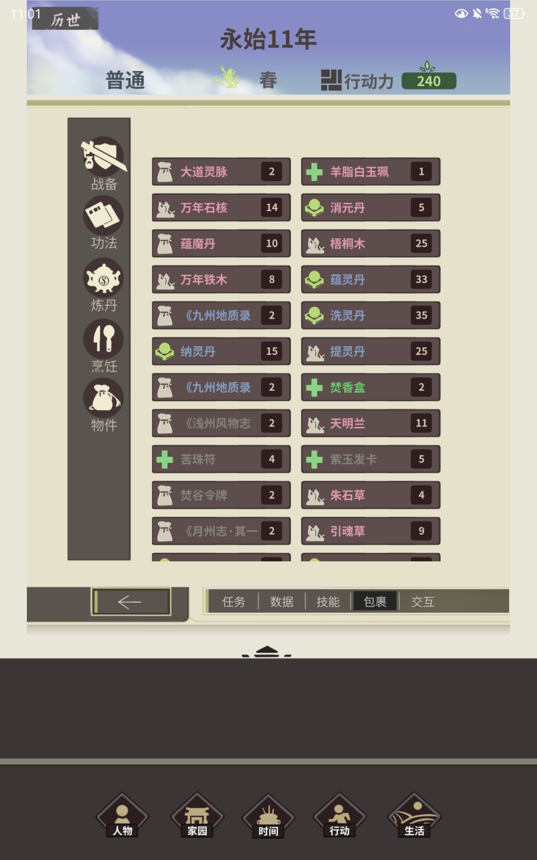 1.天赋:亿机。植物妖兽。健身狂。 2.开局属性:木。 3:开局带剑。福源大于0能刷出来人气客栈就行.最好大于等3。sl测福源的时候看一下秘宝位置 开始流程: 14岁:开地图。挖土。 15岁:升二阶。做秋季任务。留在原地进大牢。不过结局的可以考虑卖掉秋季的。 sl出智力夺取。紫气东来。血蛊.千结花中的两个。优先千结花。 16岁:春季开拍卖行。搞归尘剑跟悬赏。拍卖千结花。要不然钓鱼没钱。接任务去解锁