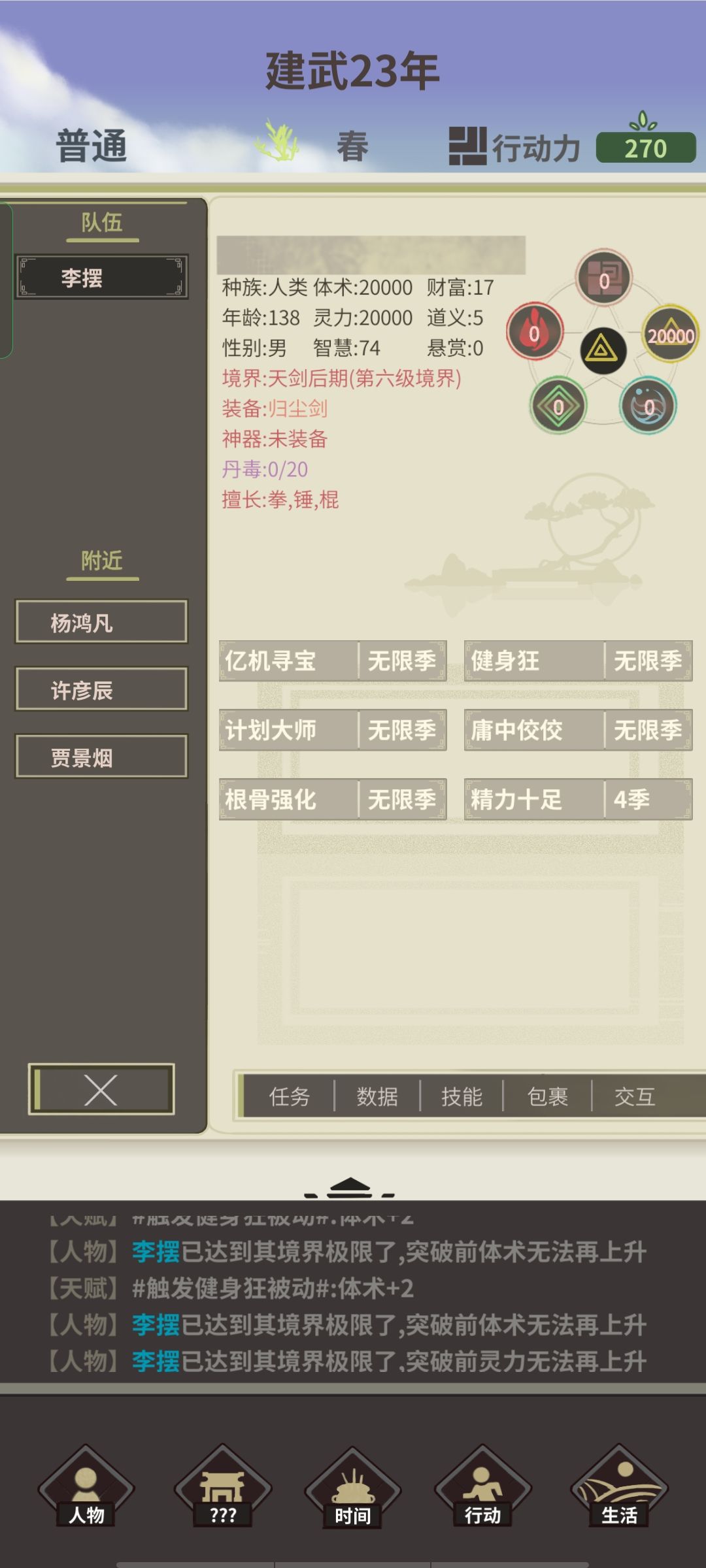 天赋选亿机建身和破烂王,点15智慧加炼丹,门派选剑一。 前面剑一正常玩法,28岁会武可以不去,一直刷到五境,去拿天外来客状态,然后卡属性去拿亦澜剑诀(这里体术最好低灵力两点,因为有健身狂,点阁顶老人事件也会加体术),做完就继续刷钱,到1w剑意后把清饮换成万一再学剑体。这些都弄好了,就可以刷属性,没什么好说的一直刷到2w体1w灵就差不多了。此时年龄120-160上下,接着去逛逛拿罡气血蛊和智力夺取,
