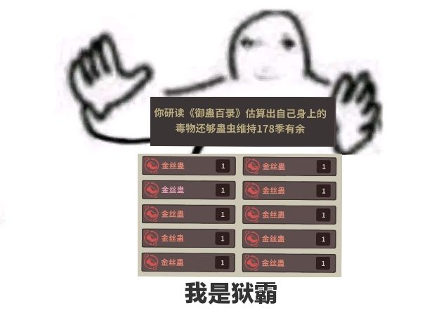(前排提示,蚀月前期坐牢) (因为sl可以节约大量行动,本攻略含大量sl) 天赋:蚀月传人,亿机寻宝 流程: 一直捕毒直到捕毒等级5(花费23年) (在有亿机寻宝的情况下轻度采集收益更高) 这时候我们就可以开始炼蛊了 通过sl捕毒获得仙品蛊引 (我们只需要金丝蛊,所以炼蛊的蛊引中必须包含金丝毒甲,并sl保证成品为金丝蛊) 如何减少毒物消耗: 三境和六境时宗门商店会有减少毒物消耗的复育术和轮养术 进