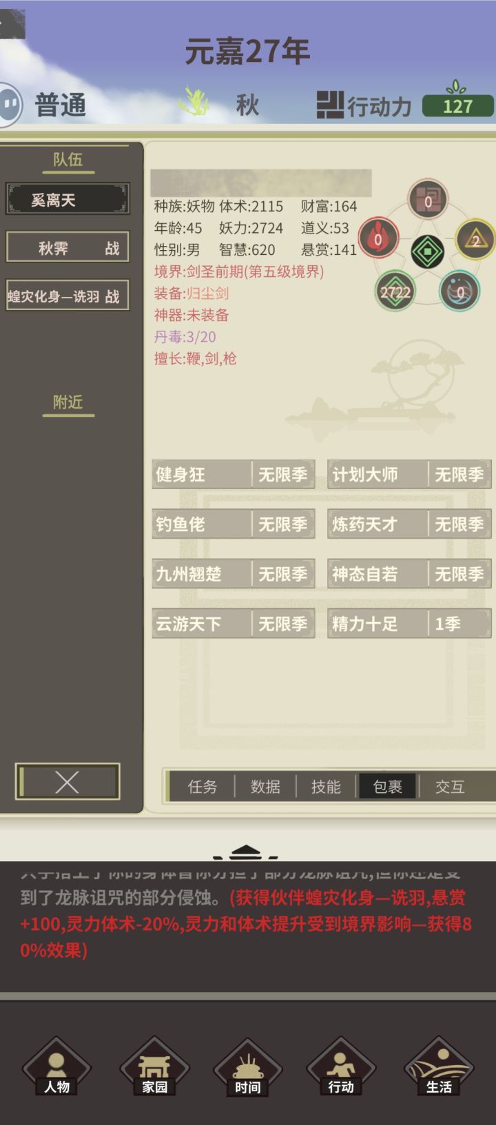 天赋:亿机,蚀月传人,体虚,炼药天才名称:折纸白鸢 第1年,木属性。去九罗开风啸荒原,去风啸sl客栈(此时正好190行动力)(精),去九罗把该点的点了(除了聚宝),练一次蕴灵丹(把丹药全吃),去梦泽解锁钓鱼,sl事件,拿气运,智力夺取术,店小二 第2年,sl事件,闻道和探讨拿了,去捕毒(中途拍卖一个仙品材料,1350),捕毒,去迷失外围sl客栈(精),年末寄拍仙品材料(两个仙品材料分开拍