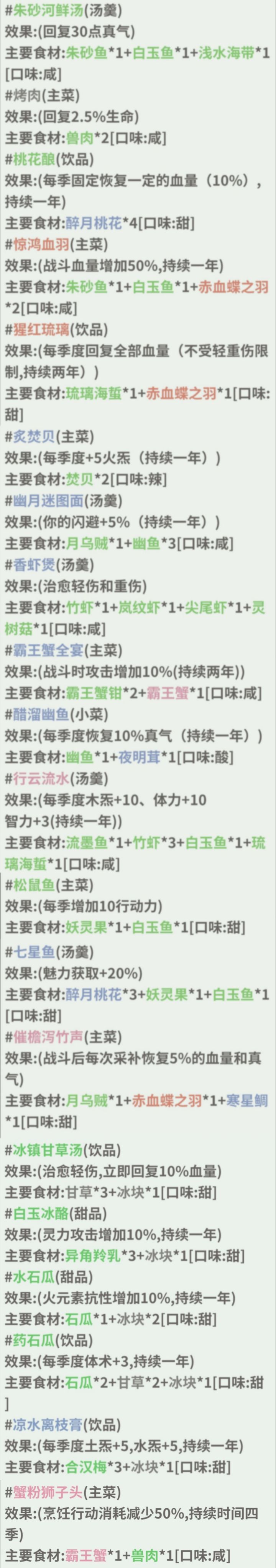 关于烹饪相关的物品获取(先后顺序按图鉴编号排序)食材0.朱砂鱼:钓鱼1.白玉鱼:云州钓鱼2.流墨鱼:中州钓鱼3.霸王蟹钳:3级钓鱼(在同一地点钓到霸王蟹前两次会获得蟹钳,第三次会获得霸王蟹)4.霸王蟹:3级钓鱼5.月乌贼:月州钓鱼6.竹虾:轩州钓鱼7.岚纹虾:岚州钓鱼8.琉璃海蜇:虹州钓鱼9.金芙蓉:宁州2级钓鱼10.幽鱼:浅州钓鱼11.焚贝:启州钓鱼12.浅水海带:钓