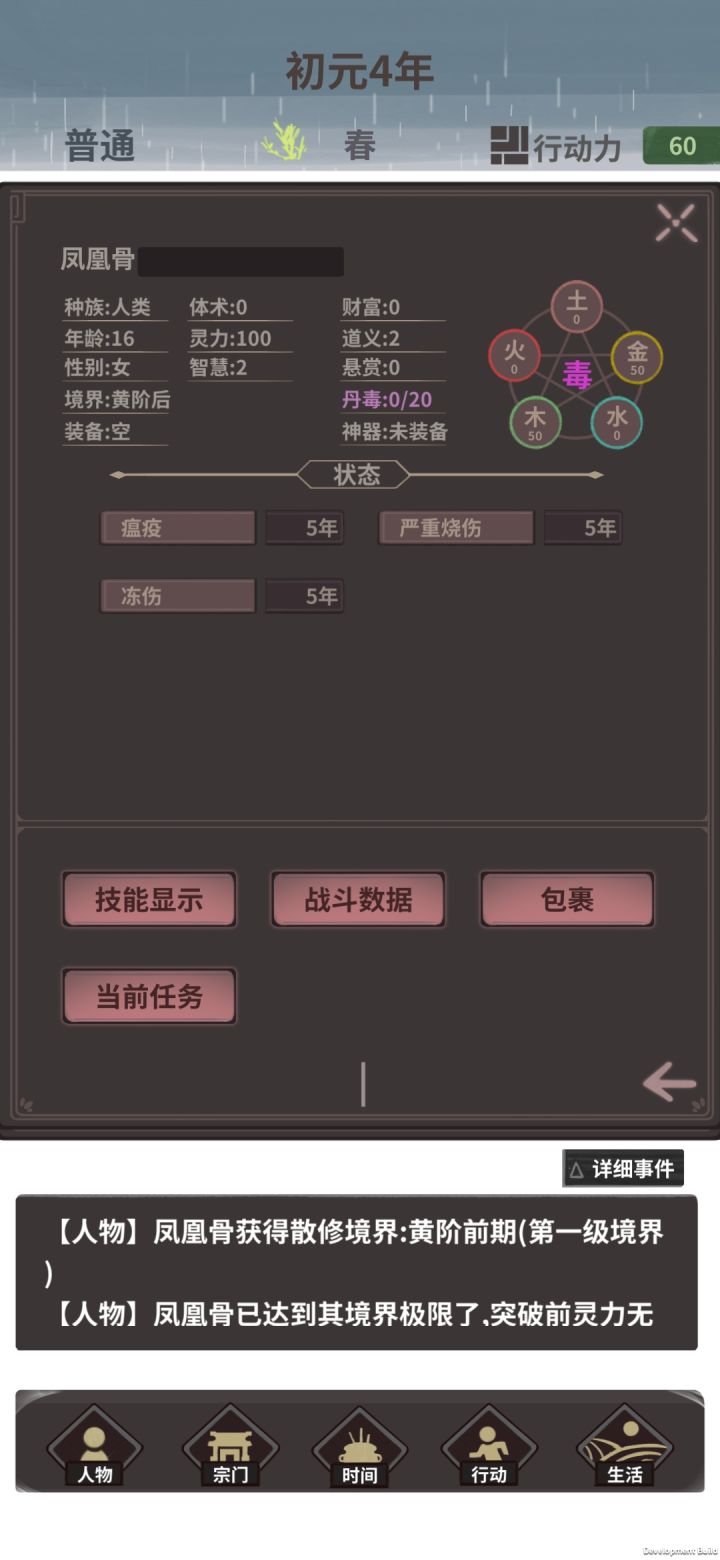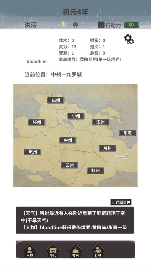 经过了一个多月的惊天动地的制作,新版本终于是推出了,足足有三百多条更新内容,具体更新内容见:接下来将对主要更新内容进行介绍:1.UI系统和游戏流程重做这个版本将UI系统大改了一遍,从之前的人生模拟类的纯选项型UI改为了有些RPG风格的UI类型。同时游戏的流程和结构也有了部分修改,增加了行动点机制,并且将行动,地图和宗门分开成为三个页面,这样不再像之前一样紧凑拥挤在一起,专精一个方面的玩家也更