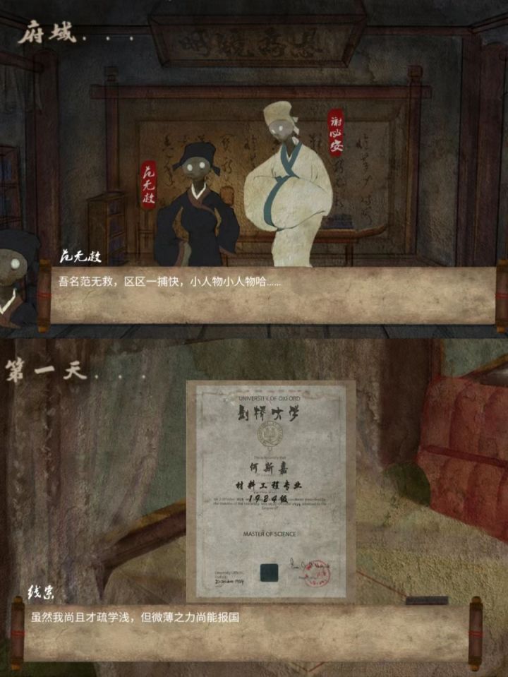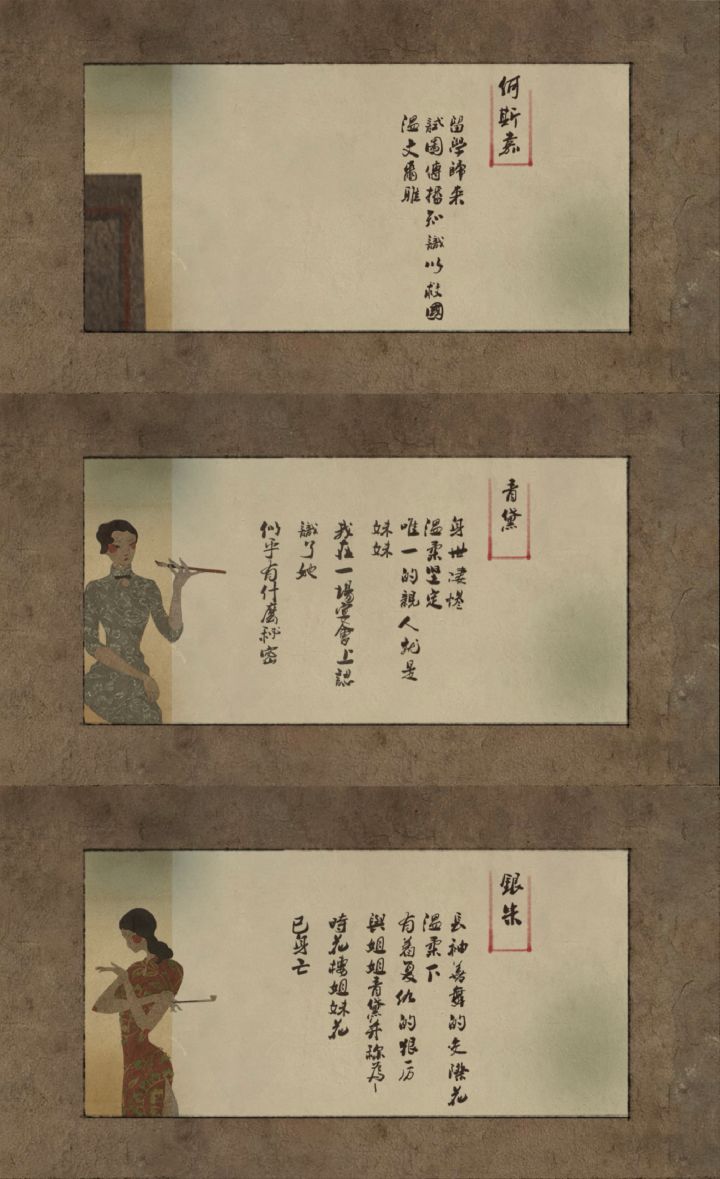 很简短的游戏,达成了【结局一】和【结局三】。至于别的结局,按网上的攻略试了,还是这两个结局;又想到会不会是这个版本的问题,只呈现了部分内容,又从百度上下载了游戏APP,但是内容一模一样,还是这样的结果。这个游戏的画面很有特色,是这种立绘风格的,看到的第一眼立马想到了《天书奇谭》里狐狸的扮相,很不错。游戏的故事情节和人物角色设定也是不错的,归国青年何斯嘉的身世之谜、莳花楼银朱之死、面具店老板和若姑