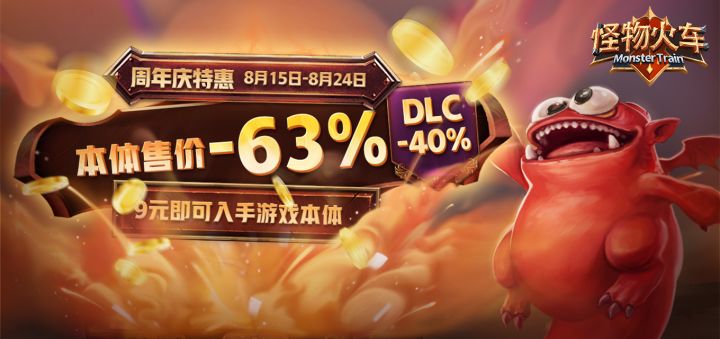 各位小伙伴们!大家好呀,为了庆祝良心工作室六周年,我们给大家带来了《怪物火车》折扣活动!《怪物火车》共庆周年折扣活动!18元即可畅玩完整版!💥 【限时折扣】折扣时间:8月15日10点-8月24日16点折扣价:游戏本体(氏族合集包)售价:24元→9元DLC“最后的神祇”售价:15元→9元18元将《怪物火车》全部内容打包带走,享受经典Roguelike卡牌构筑!注:【游戏完整版】包含「