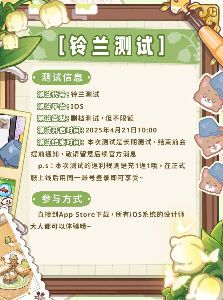 汪汪汪!汪呜~汪汪汪汪!汪呜~~(一些小狗的庆祝仪式)终于能和iOS的设计师大人见面啦!(本来以为能早早上线,结果被拒审10次辛苦大家久等了!※本次测试的代号是——铃兰测试※依旧是删档、不限名额测试,(周一)4月21日10:00前往App Store即可体验~更多细节请左滑图片查看~聪明的设计师大人都猜到了吧,没错,我们上新了铃兰主题的家具套装!在铃兰花盛