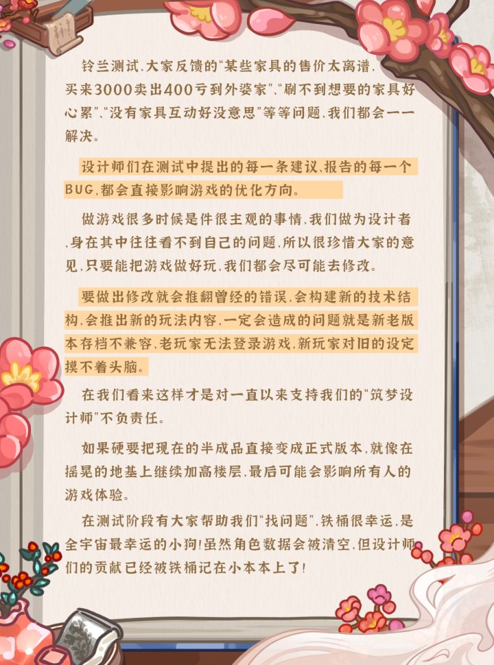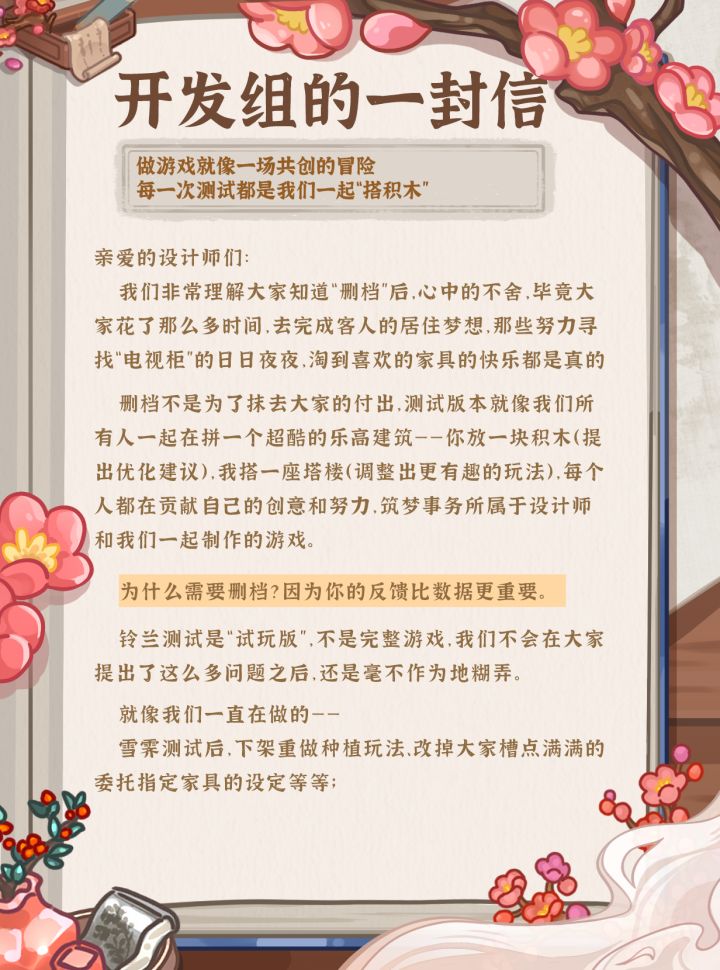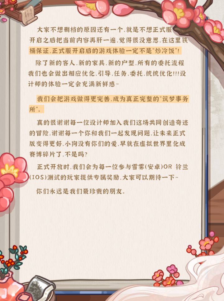 哈喽各位设计师大人,铁桶来送信啦!是关于删档的问题,大家的感受我们很重视,所以饲养员和本汪写了一封长信给大家,👉🏻左滑图片可查看⭐总结版:目前的版本还有很多优化空间,大家的建议会尽量去实现,删档是为了更好的游戏体验,所以没有选择贸然在这个版本上面叠加内容,因为这是对大家的不负责,也是对我们初心的践踏。❗正式版绝对不会是炒冷饭,我们会给大家更好的筑梦!