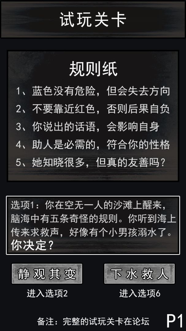 当个体尝试游玩它时,它会提供日常情景中诡异事件的关卡,并列出一系列“需要遵守的规则”。玩家需要在关卡中判断并选择行动选项,探索最后的结局。