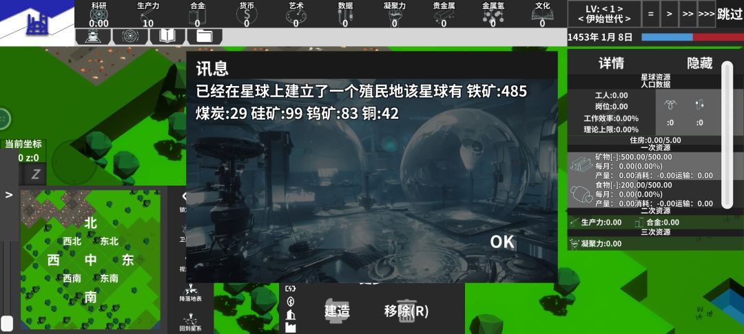 开局先造简易房屋和农田,接着造深邃钻井挖矿,造风电发电。然后不断增加人口和铺建筑提产能滚雪球。 有一定能源和铁产量基数后造一些实验室,科技点可以升产能和节能。 注意,风电升节能无用,火箭发射器等升产能无用。 前期不要管比特,因为需要比特合金等高级资源的建筑,效率都非常低,同样不需要管产业等级,因为产业等级只跟解锁地图有关,升几级什么也不能解锁 科技点优先点铁矿产量,其次点风电产量,等铁矿产量有几百