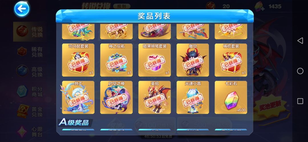 首先,我们先讲明能够进行操作的前提条件: 1-有作为本金的900七彩石(本周七彩石活动福利还算可以的,大概氪个90r左右就可以领到900) 2-传说抽奖的s级奖池全满(为了保证传说徽章可以稳定转出成七彩石)如图所示 如果这一条件没有满足,一定,一定,一定不要尝试,因为只要你这个奖池没满,基本没可能出七彩石的。 3-传说兑换的保底次数剩二十次以内(理由同上,为了避免有人太非无法提前抽出奖励,当然,欧