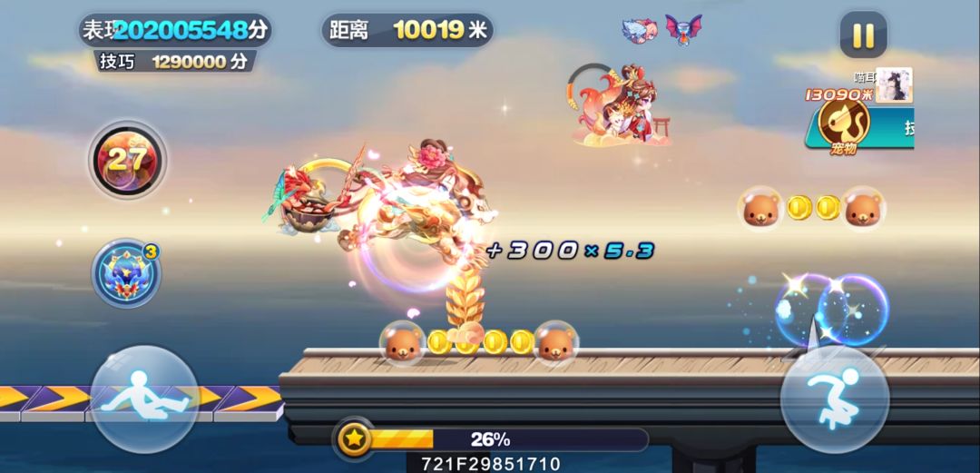老规矩,三阶段得分 说一下技能和得分机制,一开始我以为是超奖得分,实际这坐骑和混沌一样属于坐骑专属技能得分,与混沌的区别就是混沌技能自带飞星得分,天狗需要关外加足够多障碍才能有高额得分。相对混沌得分操作要求更高。 进入超奖内自带磁铁效果,有能量的话就会触发进击模式,消耗能量出现月亮,然后技能说明是打月亮有超高得分,实际这月亮打了压根没什么变化,就很离谱。在奖励关外会定时发动冲击波,向前方批出一道很