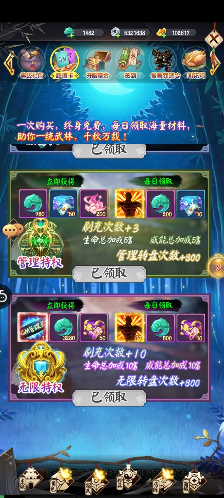 世界聊天要30块,元宝送的多,消耗的话还是可以的,至少我从1买到15的礼包元宝还能剩老大一部分,也有送可以加真实充值的卡,升级至尊用的,不充钱也能白嫖高级至尊,日常任务会送点充648的,一次机会可以拿到两次充值648的元宝,就是那满屏的充值跟战斗速度,神兵的动画,太让人恶心了,本来就几秒钟的事情,动画拖延下时间很烦,总体的话对于我来可以玩,gm版的游戏,不在意排行榜的可以试下