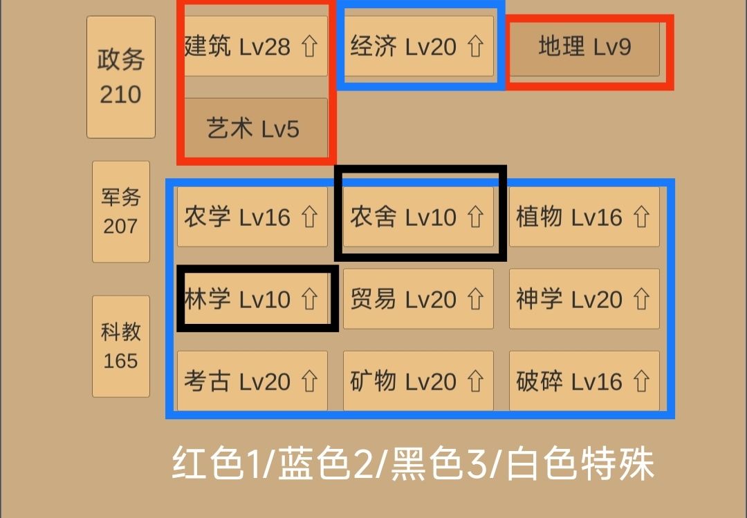 晚上睡不着。写个科技攻略和大家探讨一下。仅代表个人看法,各位大佬嘴下留情。 首先必定要升级的8个科技 经济,建筑,考古,白学,军事,物理,数学,教育。 前期三子:经济,建筑,考古。 在游戏前期15级以内无脑升级这三个,20以内酌情优先考虑。 优先度经济最高,经济可以减少升级黄金建筑时的黄金开销。 其次是建筑。每一级建筑学可减少一级所有建筑的升级条件。 考古可以抵消一个圣物的负面效果,本质上减少圣物
