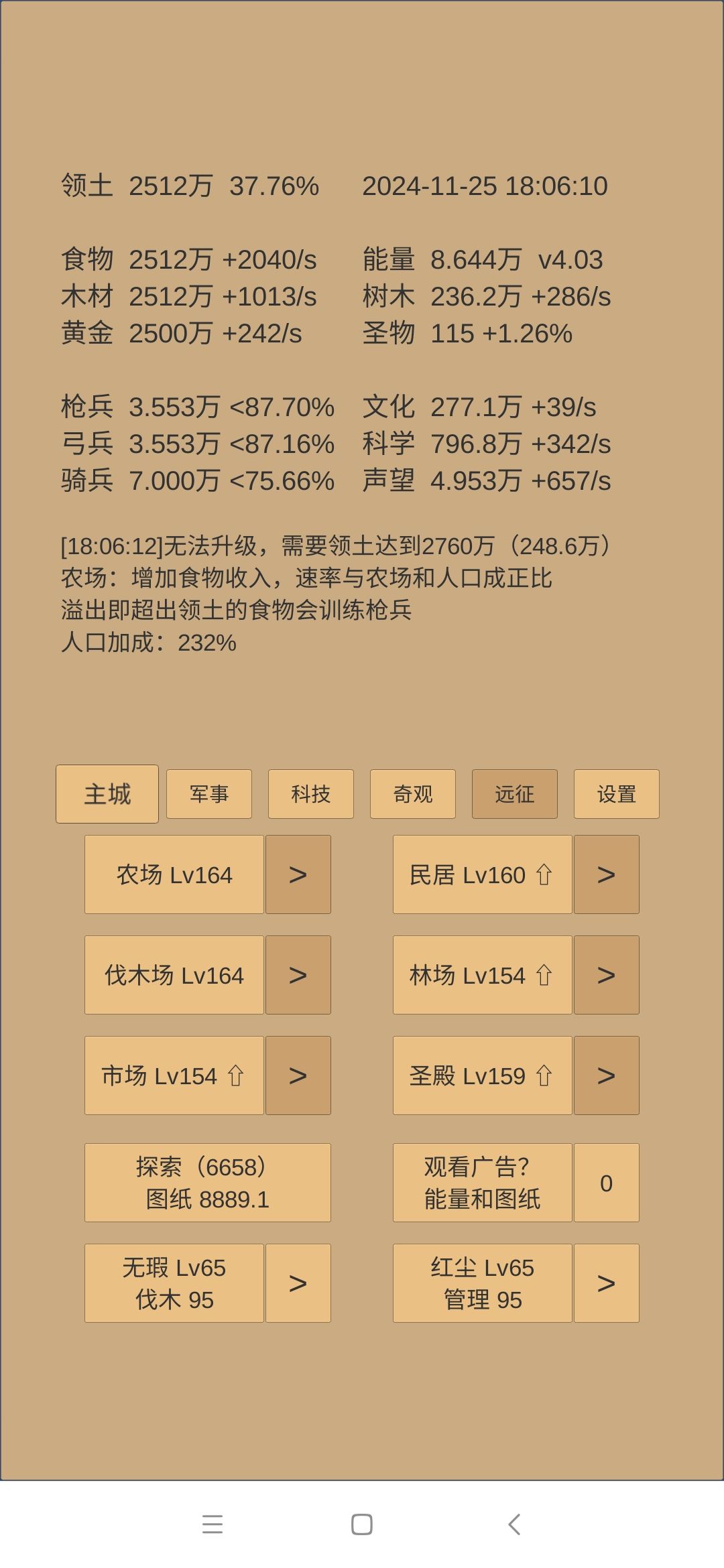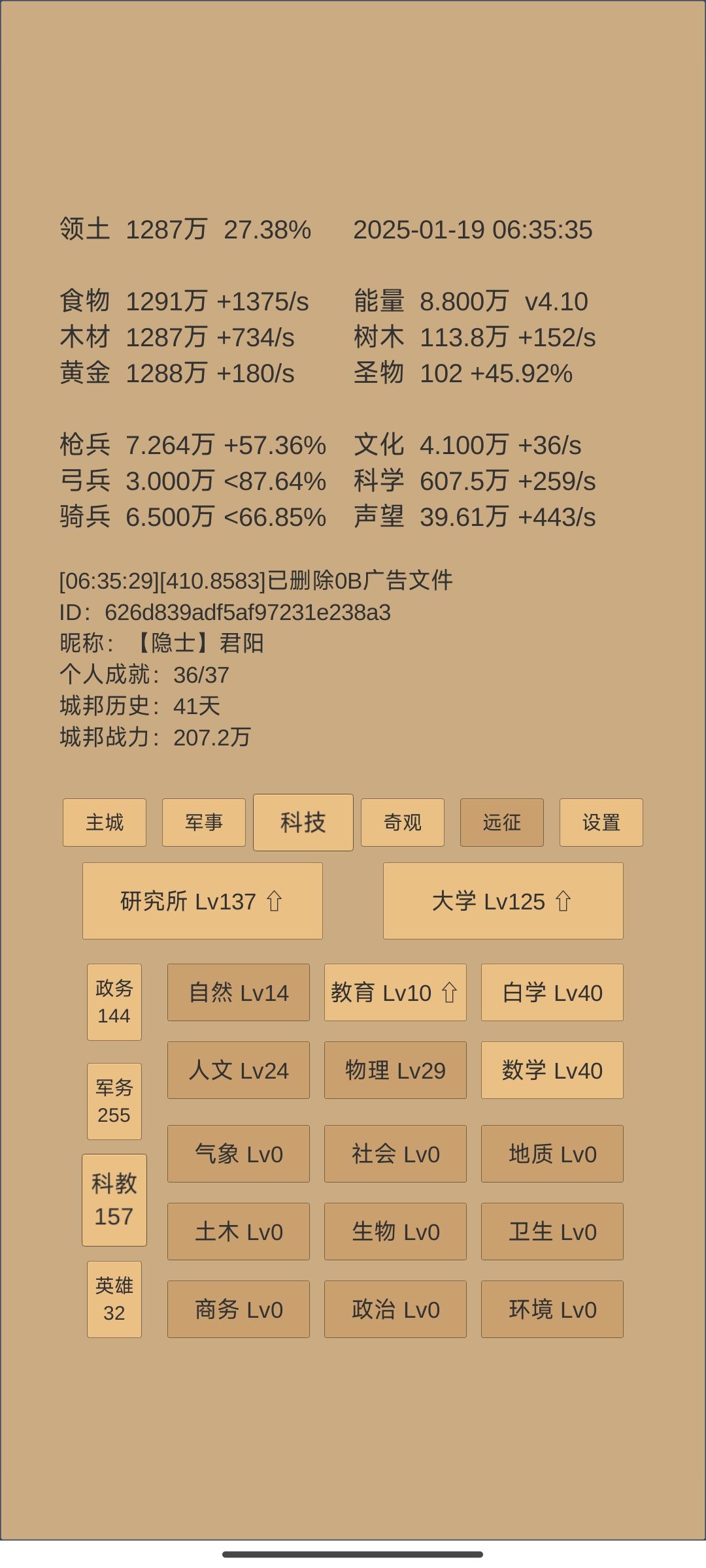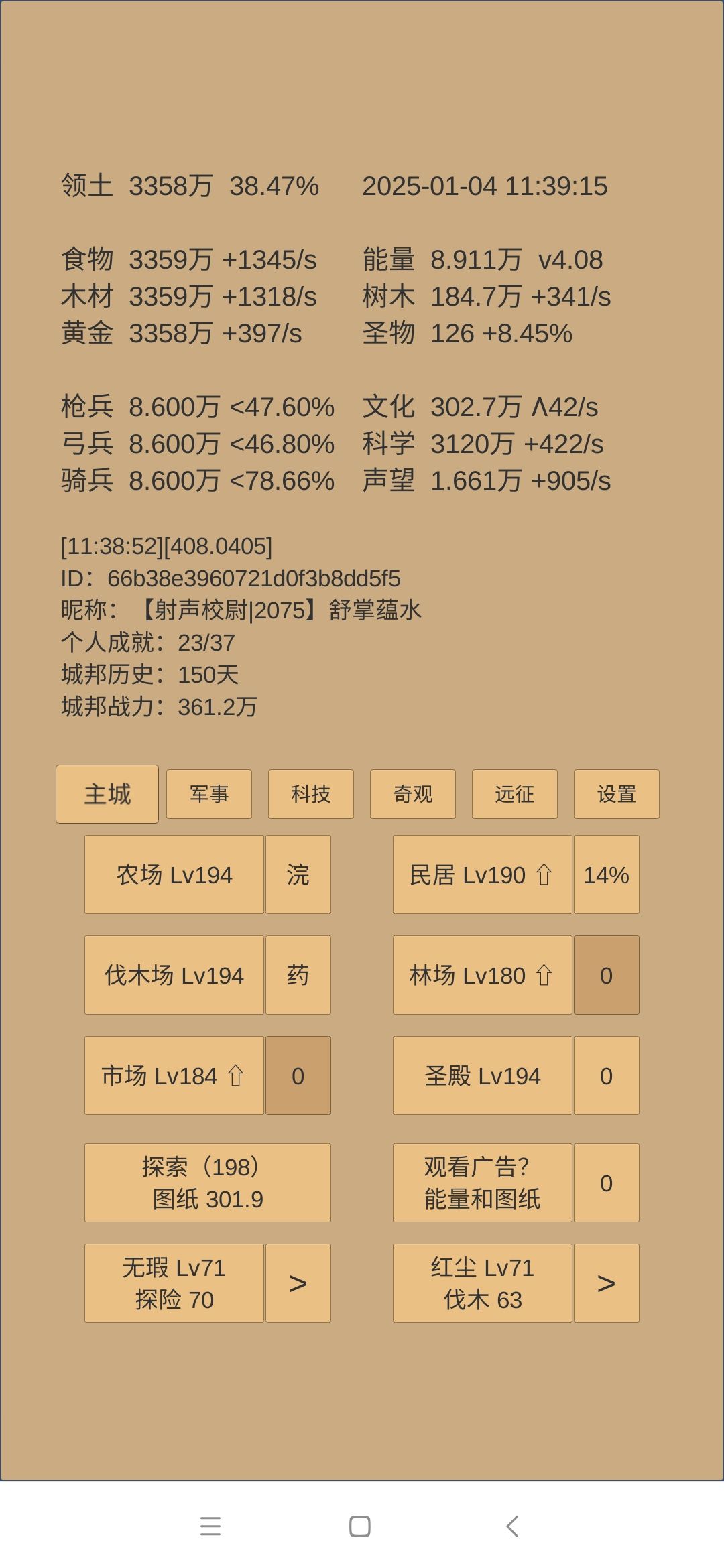 概括:较好地完成上一阶段末制定的目标。 247天拿下了乌刺(跃迁53天,合300天),远征方面接下来就是吃3/秒的贡品红利了,接下来几个阶段都不太可能再强行去推远征。药会着重用于推四境或者考虑升级一下药园。 建筑这块,由于今天刚升了博物馆,上限到了230,所以民居肯定是要拉到230的,目前差点食物还差两级。 科技上,自然升37,地理要突破,升22,然后结合要推四境的目标,抛射列阵冲锋升42,靶场上