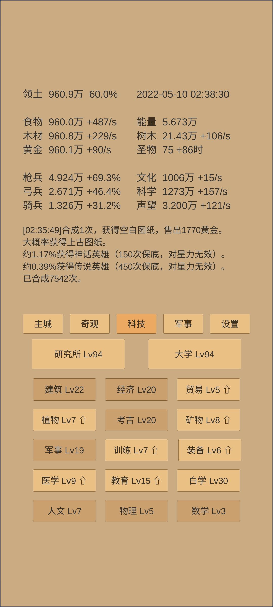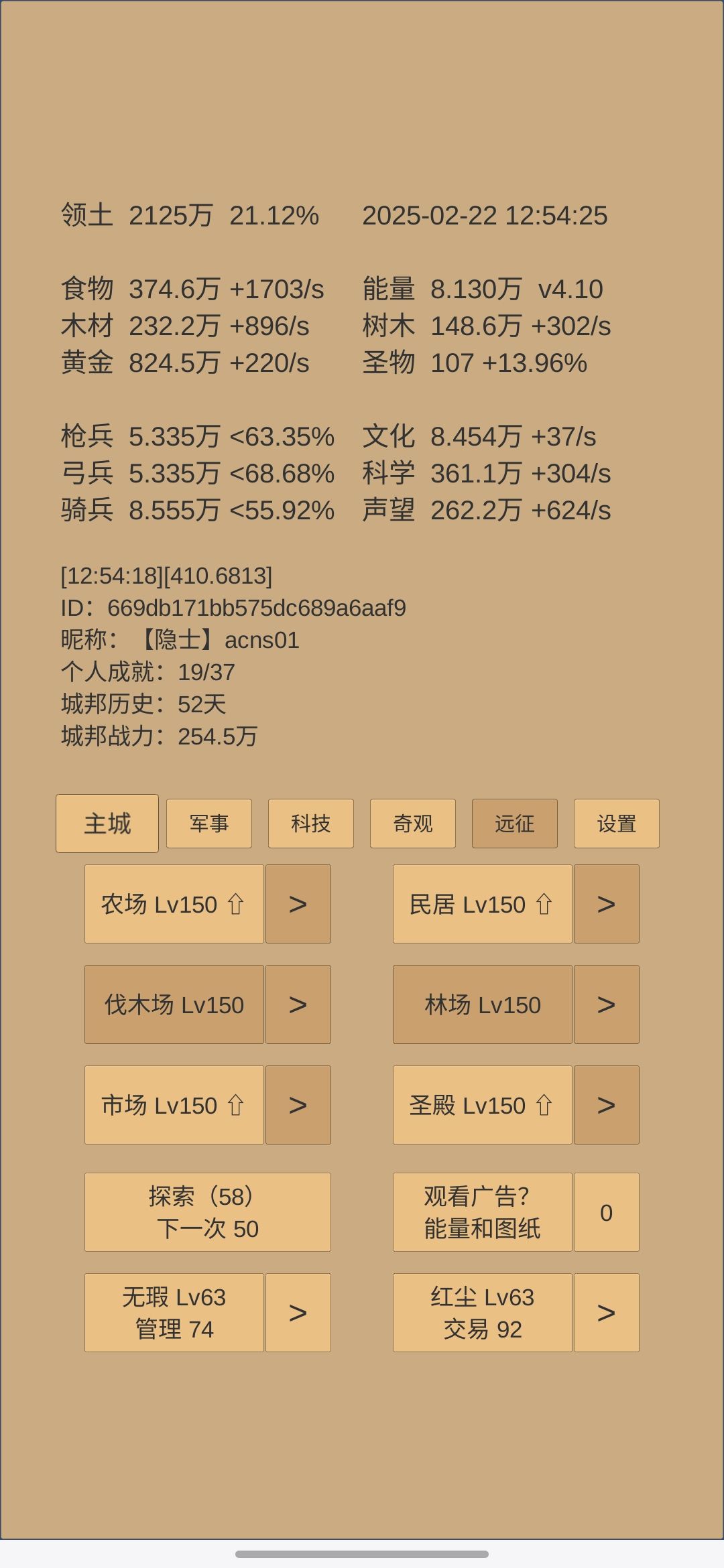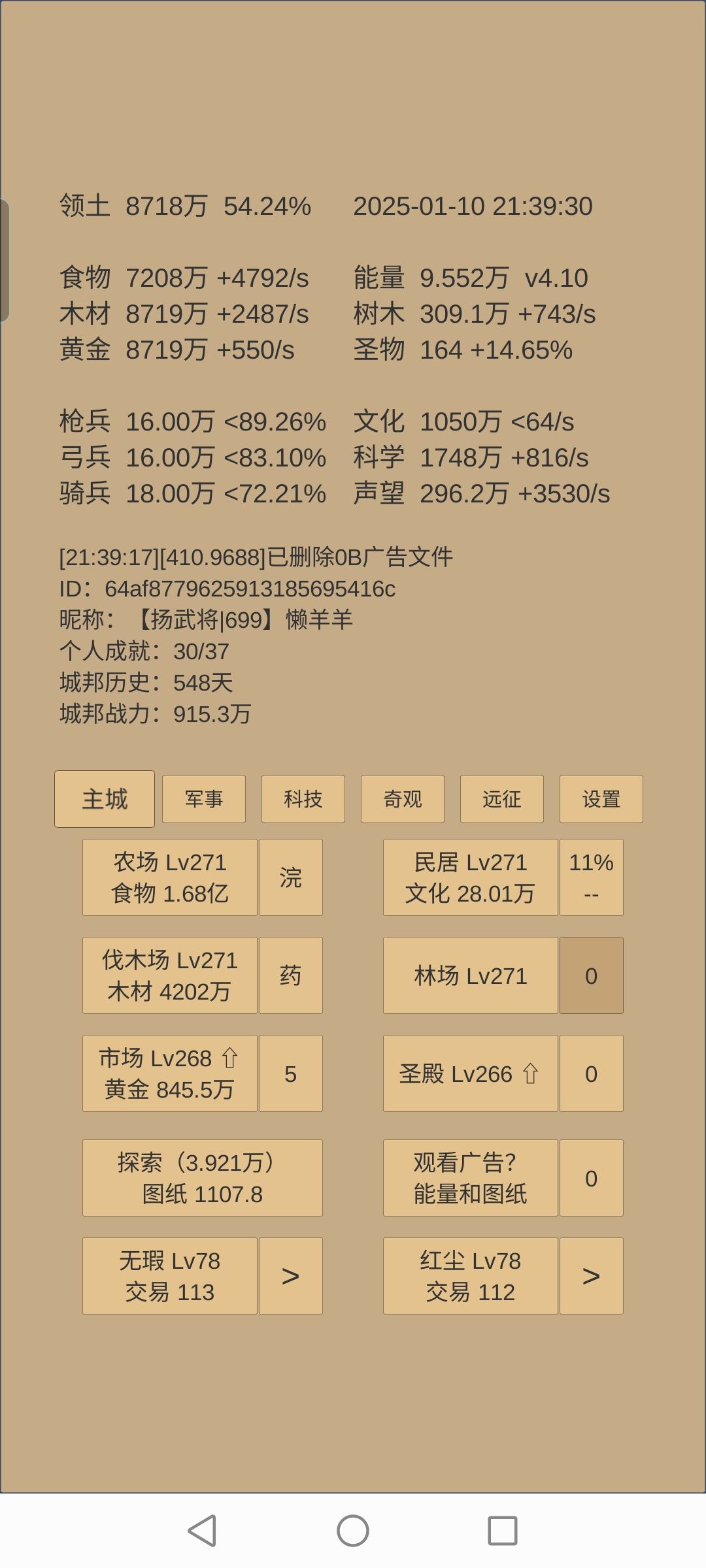 概括:较好地完成上一阶段末制定的目标。 247天拿下了乌刺(跃迁53天,合300天),远征方面接下来就是吃3/秒的贡品红利了,接下来几个阶段都不太可能再强行去推远征。药会着重用于推四境或者考虑升级一下药园。 建筑这块,由于今天刚升了博物馆,上限到了230,所以民居肯定是要拉到230的,目前差点食物还差两级。 科技上,自然升37,地理要突破,升22,然后结合要推四境的目标,抛射列阵冲锋升42,靶场上