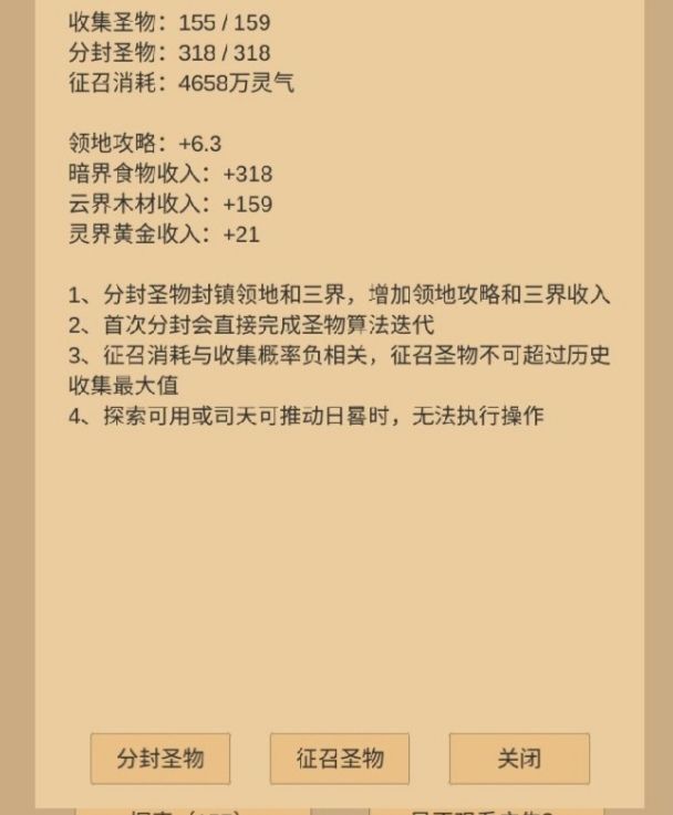 稍微总结一下圣殿分封和召回吧,欢迎大佬们指正补充,谢谢。 1,先点满考古和圣殿,故宫快升级了的话,等故宫升级。 2,所有操作之前先存档,这条重中之重(传说中的后悔药)。 3,用探索和贡品搞满武馆灵气(也可以用于第1条里的圣殿升级),因为分封和召回需要用光探索和贡品(这是前置条件),召回圣物有部分需要用灵气召回,圣物概率高灵气召回花费就低(好像是这样)。 4,每次全部召回的话,可以分封两次,从而提高