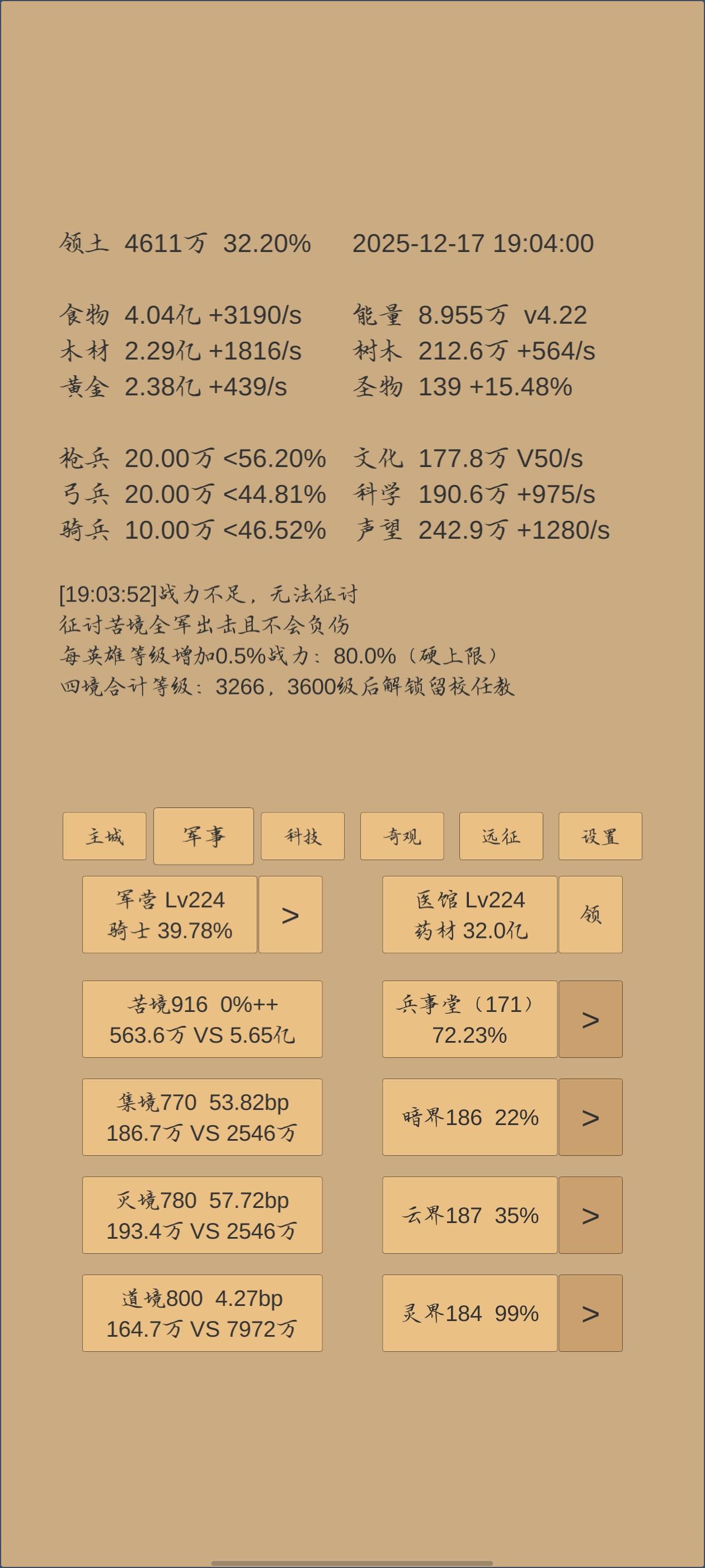 3.兵在精,不在多。要牢记,科技是第一生产力。不要刻意屯兵去开疆扩土,用科技让升阶的兵来提高战力,这样会省药。这个游戏几乎所有的资源都会带来收益。只有药材不是,打仗失败消耗的药材没了就没了。所以我们要走精兵路线,兵不要刻意囤积。可以自动讨伐后,只开启胜率最高的部队。当随着胜利,这只部队胜率下去后,关闭它。再打开那个时候胜率最高的部队,保证药的利用收益最大化,减少药的浪费。