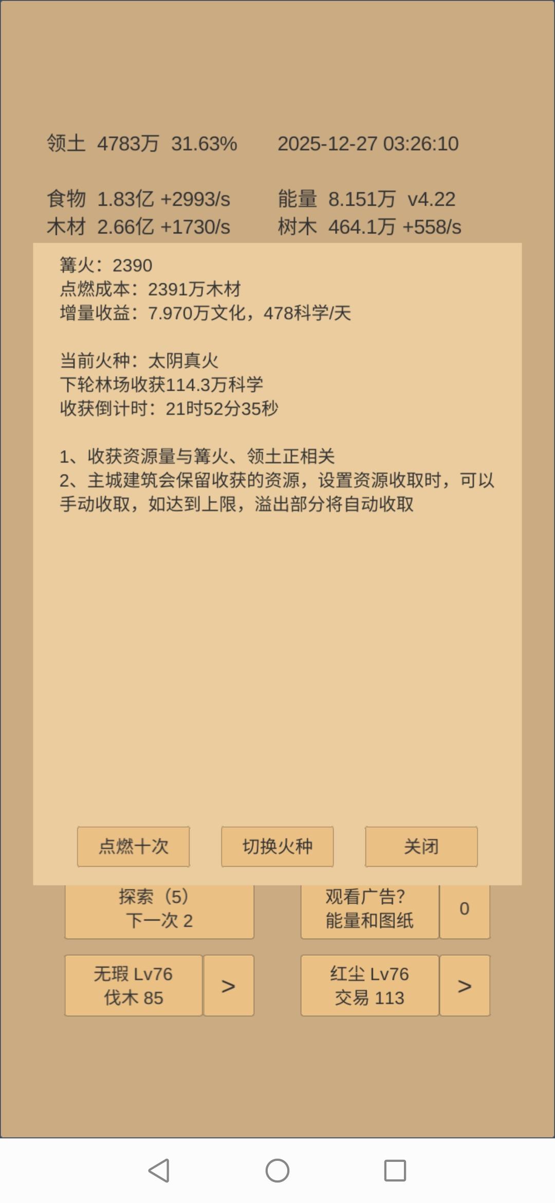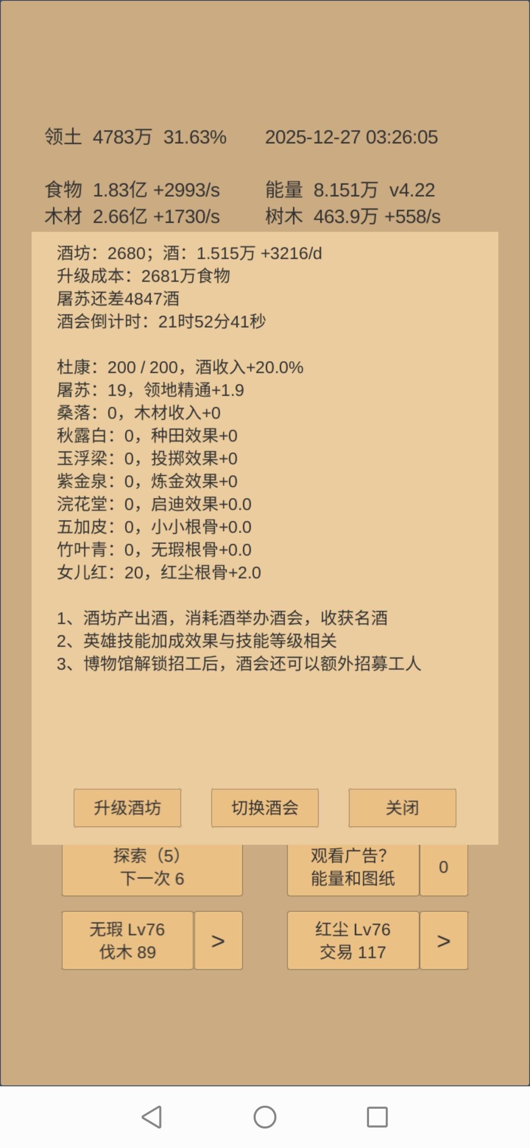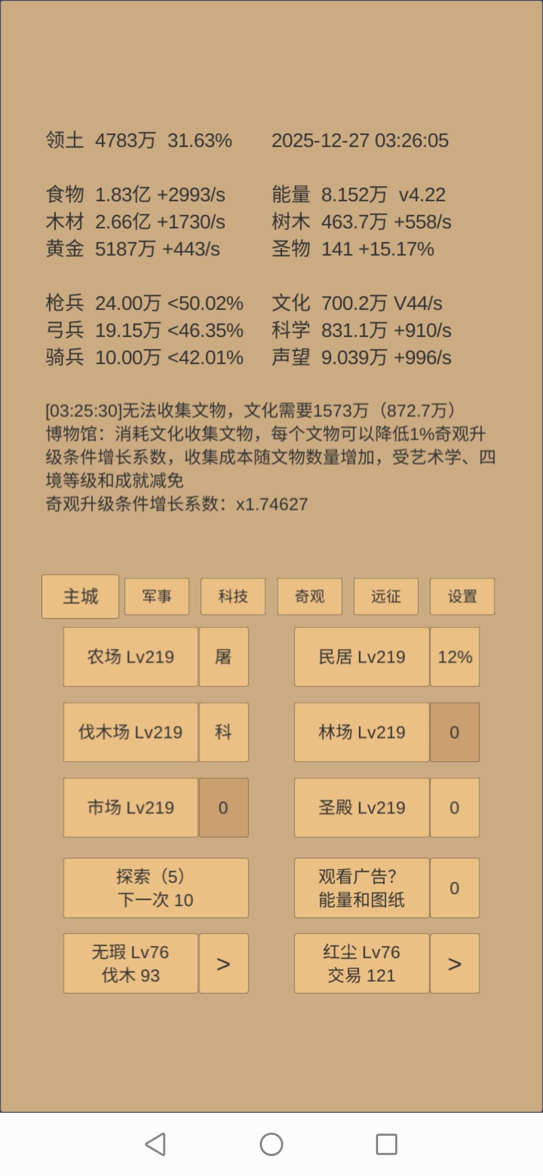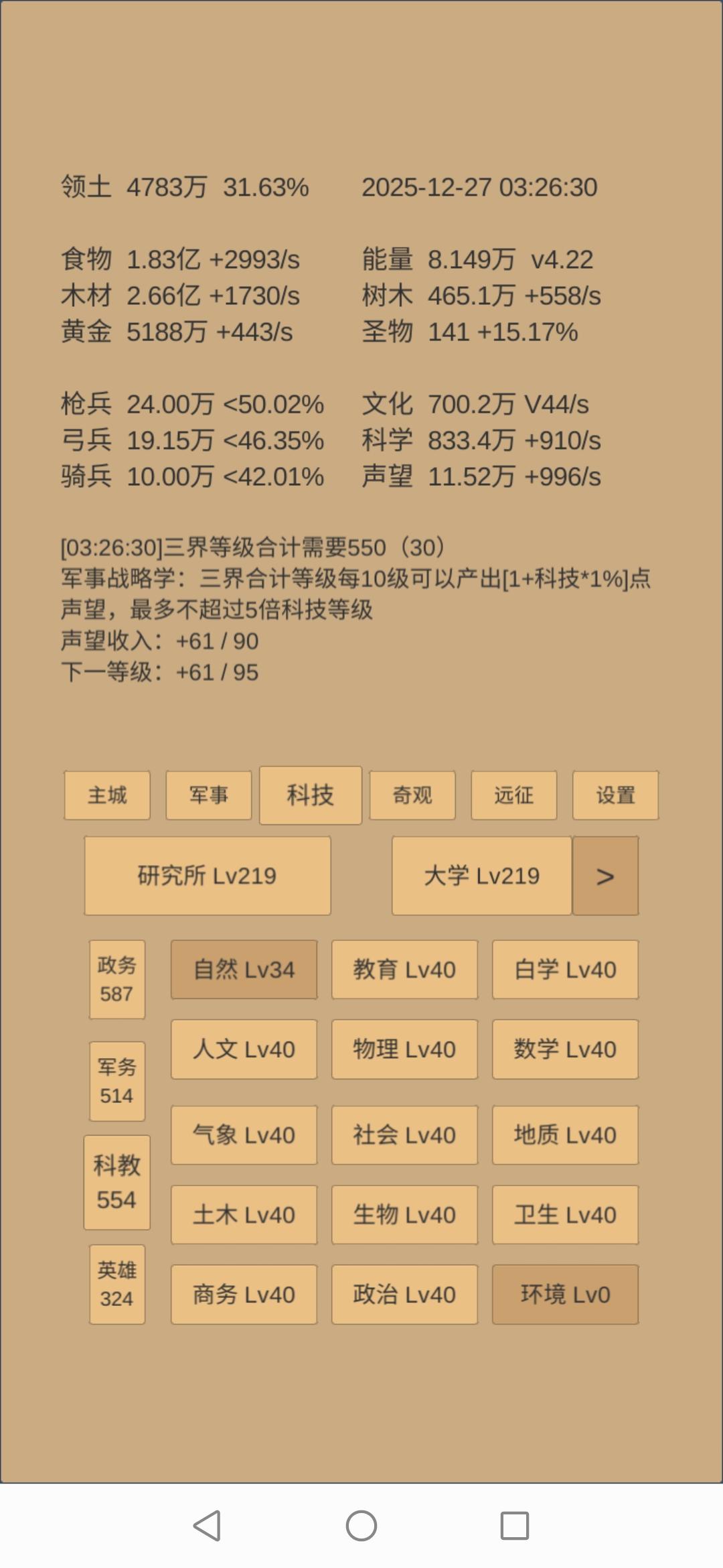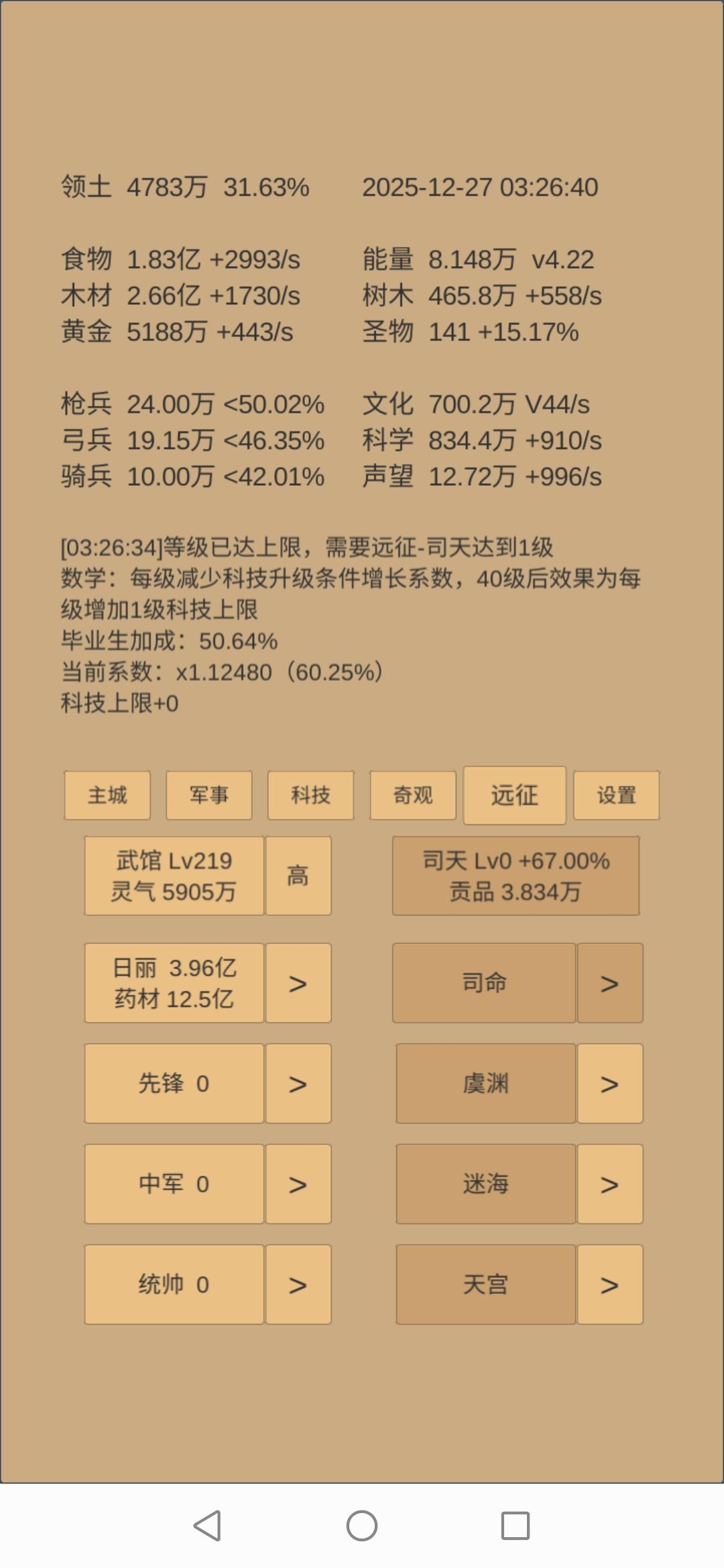 杀掉了吕宋主帅,又买入满103亿药打3亿的阶段。武学奇观陆续升级,按惯例要先出一万骑兵再升长城。食物用于提升酒馆到2000级后继续升都江堰。优先点满英雄业力科技,英雄三转后升一级博物馆。司命武曲一级后继续破军。多余科学尝试升数学,跳出舒适区